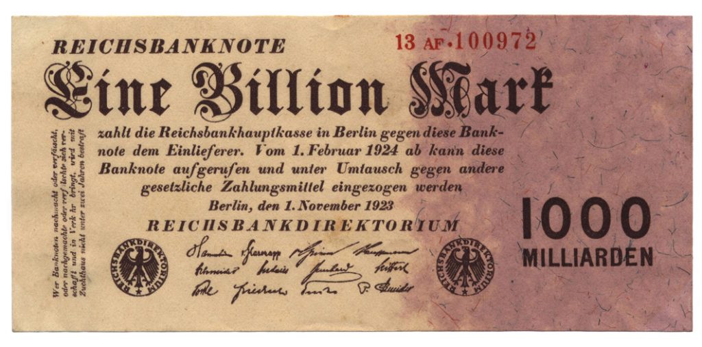 Zur staatlich verschuldeten Inflation Anfang der 1920er Jahre sind im Laufe der Zeit schon verschiedene Beiträge im Sparkassengeschichtsblog erschienen. Sie befassen sich unter anderem mit Milliarden auf dem Sparbuch oder Billionen-Scheinen. Im Herbst 1923 stoppte die rasante Geldentwertung. Im Folgejahr wurde die Reichsmark neue deutsche Währung. Kundinnen und Kunden konnten alte Mark-Guthaben bei ihrer Sparkasse anmelden, um eine Entschädigung zu erhalten. Bargeld tauschte die Reichsbank im Verhältnis 1 Billion zu 1 um.