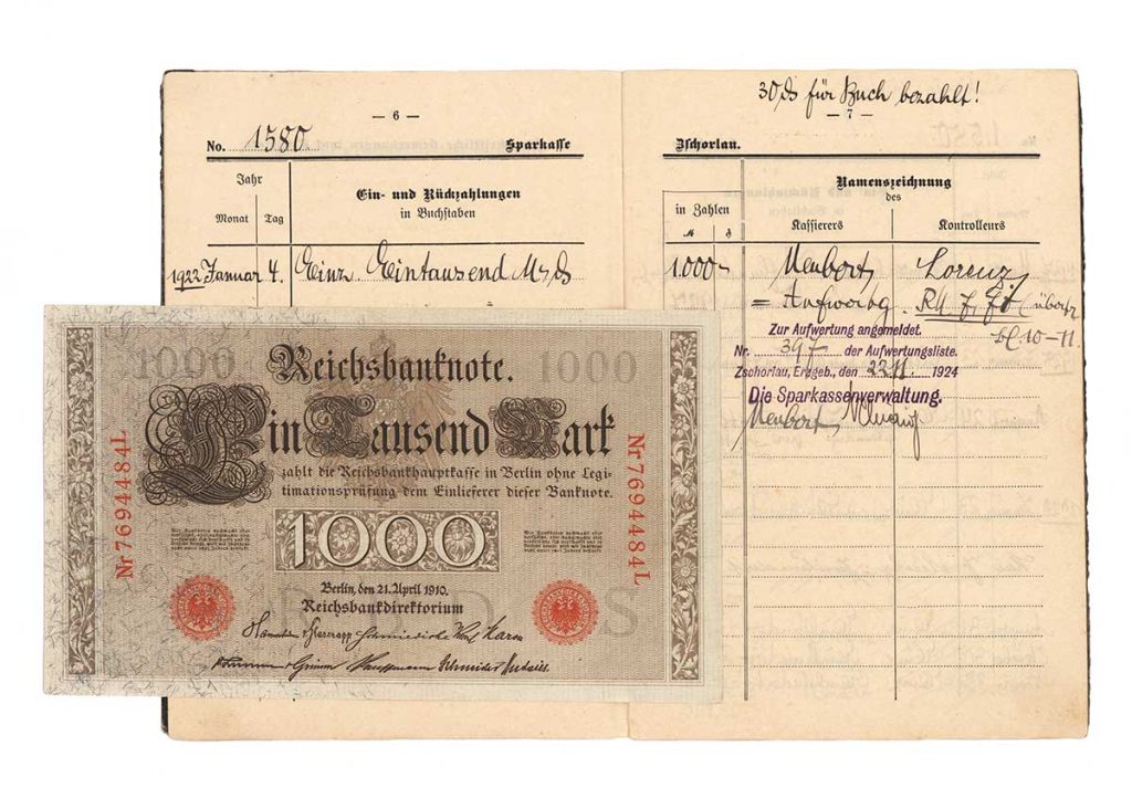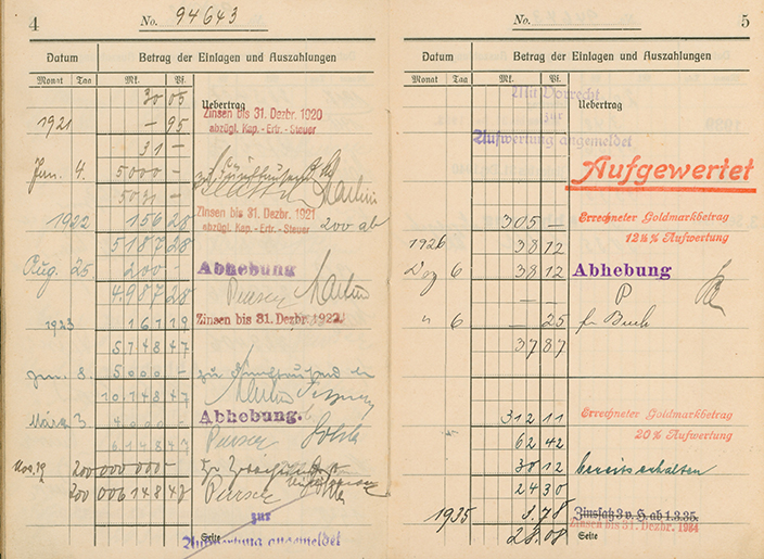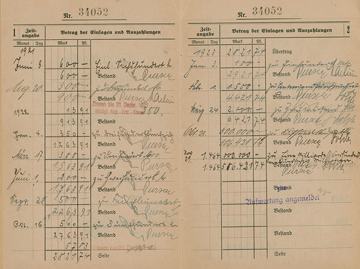 Das erste Sparbuch hatte im August 1922 ein Guthaben von knapp 5 000 Mark. Ein Jahr später waren bereits 10 000 Mark daraus geworden, nach einer Abhebung waren davon noch rund 6 000 Mark übrig. Aufgrund der im Herbst 1923 stark ansteigenden Inflationsrate wurden daraus am 19. November, aufgrund einer weiteren Einzahlung, über 200 Millionen Mark. Am 15. November erfolgte auch die Einführung der Rentenmark, um die Hyperinflation zu stoppen. Der Kurs war dabei eine Rentenmark gleich eine Billion Papiermark. Durch die Aufwertung wurden aus den 200 Millionen Mark 305 Goldmark.