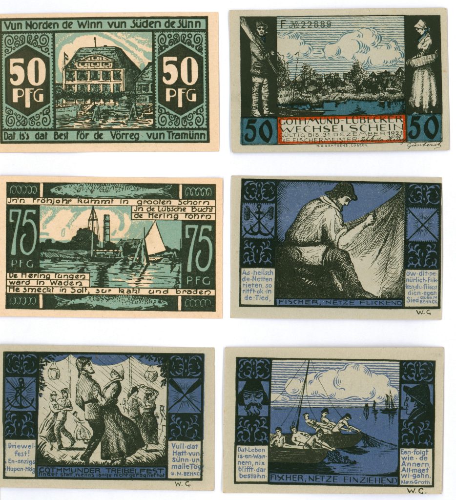 Mit seinen hanseatisch geprägten Vereinen und Veranstaltungen sticht Lübeck in Sachen Notgeld aus diesem Bestand hervor. Während unzählige Exemplare in anderen Gegenden des ehemaligen Deutschen Reiches von Stadträten, Magistraten, Firmen und natürlich auch von den Sparkassen in Umlauf gebracht wurden, schritten in Lübeck die Nordischen Briefmarkensammler und Händler sowie Fischermeister, Bäckersänger oder die Plattdeutsche Volksgilde zur Tat.