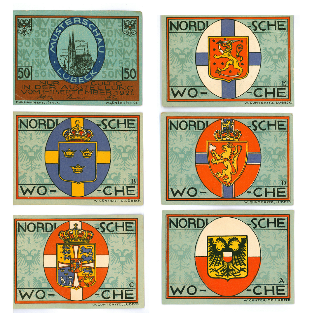 Auch die als „Nordische Woche“ titulierte Kunstausstellung aus dem Jahre 1921 bot einen Anlass. Sie stellte das Ergebnis der Bestrebung dar, auf Grundlage einer gemeinsamen baltischen und nordeuropäisch geprägten Lebenswelt Kontakte mit den skandinavischen Ländern und Finnland wiederherzustellen, um dadurch jüngere kriegsbedingte Wunden zu heilen. Dementsprechend lassen sich auf den Notgeldscheinen zur Nordischen Woche neben des Lübecker Wappens auch die Embleme jener Länder wiederfinden. Ein Symbol der Einigkeit und diplomatischen Bemühungen, welches in den Händen von Sammlern und angereisten Gästen Spuren entsprechender Signalkraft hinterlassen haben wird.