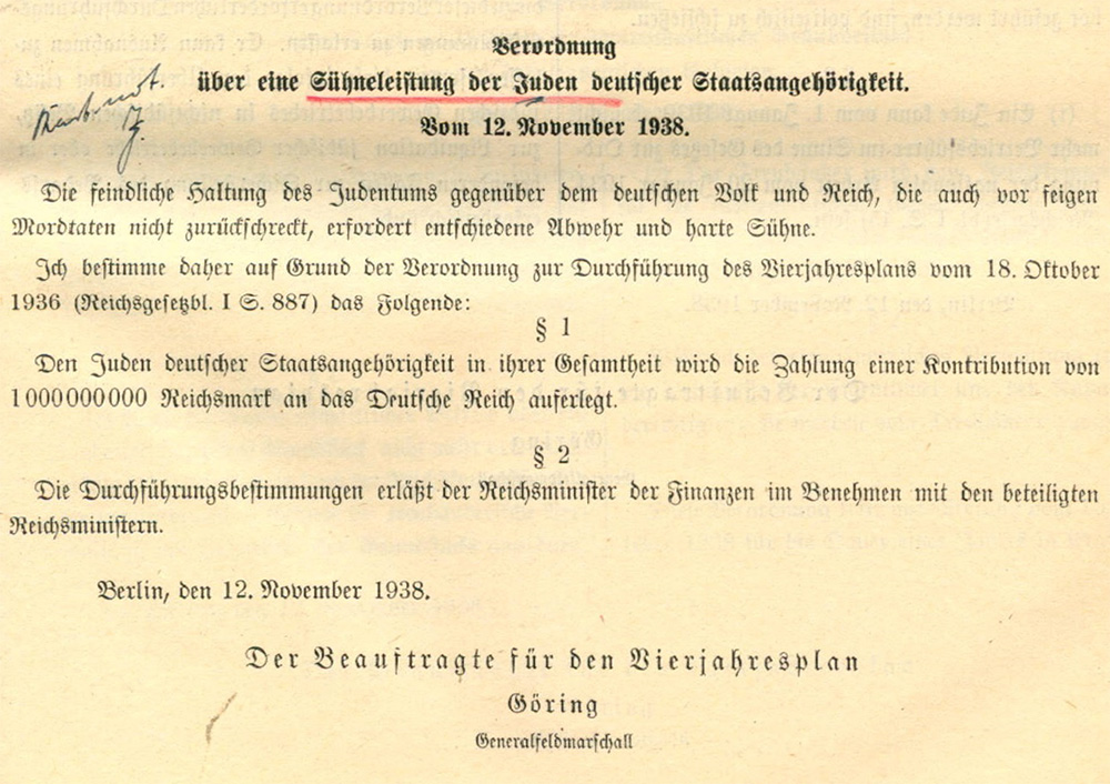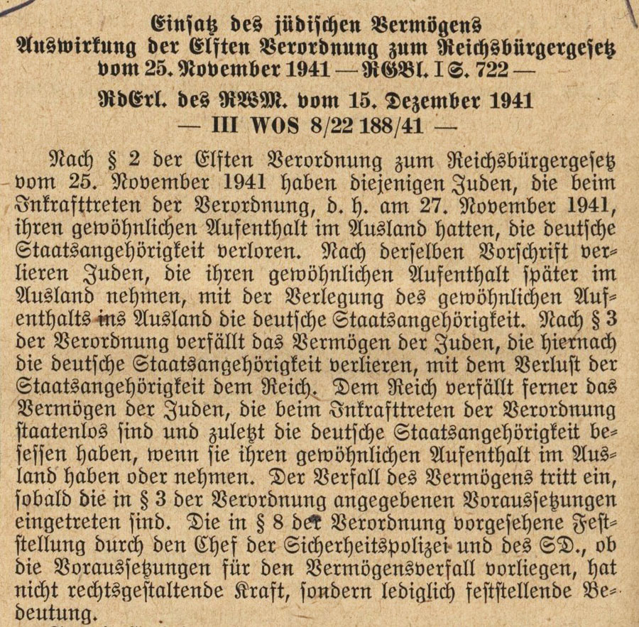 Mit der 11. Verordnung zum Reichsbürgergesetz vom 25. November 1941 schufen die Nationalsozialisten die rechtliche Legitimation, um den deutschen Juden im Zuge der Verschleppung in den Osten die deutsche Staatsangehörigkeit abzuerkennen und ihr Vermögen zu rauben. Auch bereits emigrierte Deutsche jüdischer Herkunft beziehungsweise jüdischen Glaubens waren betroffen, sofern sie noch keine neue Staatsangehörigkeit hatten. Ihr Besitz verfiel ebenfalls pauschal dem Deutschen Reich.