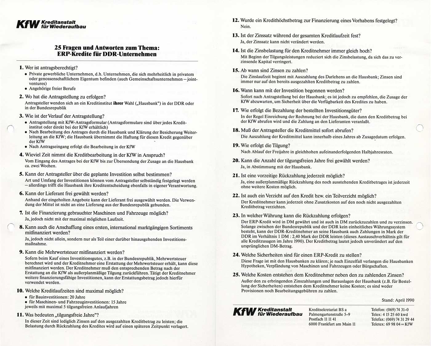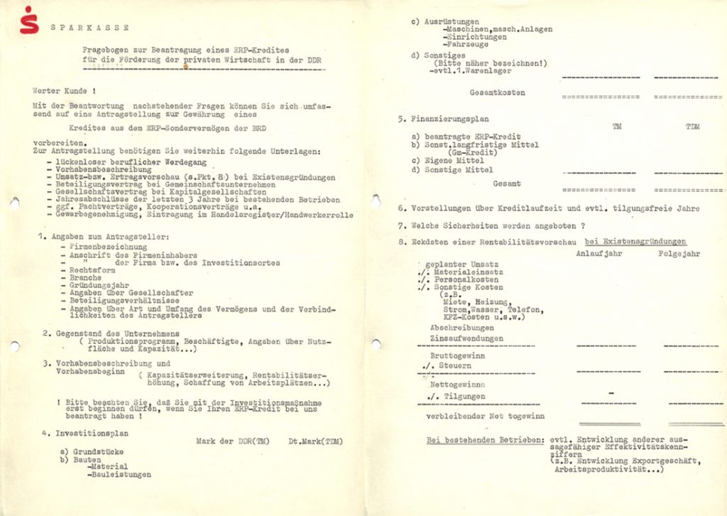 Die ostdeutschen Unternehmer konnten Anträge beim örtlichen Kreditinstitut ihrer Wahl stellen, zum Beispiel bei einer der 196 Sparkassen. Diese prüfte unter anderem die Sicherstellung der Investition, die Bonität des Darlehnsnehmers, seine fachliche Qualifikation sowie die wesentlichen Unternehmenseckdaten. Bei positivem Bescheid prüfte auch das Hauptleihinstitut. Es folgte die Zusage für den Refinanzierungskredit, wobei die Sparkasse vor Ort die vertraglich festgelegte Verwendung zu garantieren hatte. Die Ausreichung erfolgte in Deutscher Mark. Für die Rückzahlung hatte die Staatsbank für 1990 eine Relation von 1 DM = 2,40 Mark festgelegt. Die erste Sparkasse im Osten, die einen ERP-Kredit weitergab, war übrigens die Kreissparkasse Klötze, heute Sparkasse Altmark-West. Eine Fahrschule in Klötze erhielt Geld, um einen Ford zu kaufen, den sie für den Ausbildungsbetrieb umbauen ließ.***