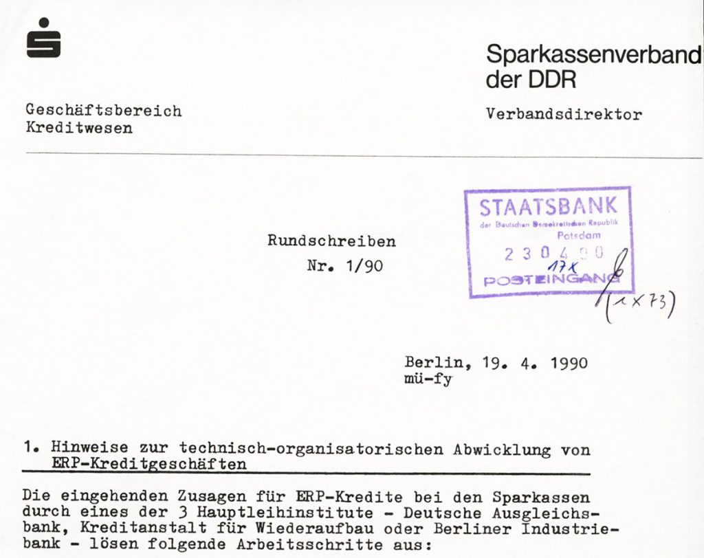 Vor 30 Jahren versendete der Sparkassenverband der DDR sein erstes nummeriertes Rundschreiben. Es informierte unter anderem über die korrekte Abwicklung von ERP-Krediten. Dank der Hilfe des DSGV waren auch die ostdeutschen Sparkassen in dieses Kreditprogramm der Bundesrepublik Deutschland eingeschaltet worden.* Der Bund stellte damals aus einem Sondervermögen, von dem ein Teil noch aus Marshall-Plan-Hilfen der USA (European Recovery Program) stammte, sechs Milliarden DM bereit. Mit Darlehen sollten kleinere und mittlere Betriebe auch im Osten gefördert werden. Die Wettbewerbs- und Leistungsfähigkeit galt es zu steigern und so die wirtschaftlichen Verhältnisse in der DDR zu verbessern. Hauptleihinstitute waren die Kreditanstalt für Wiederaufbau, die Deutsche Ausgleichsbank und die Berliner Industriebank.
