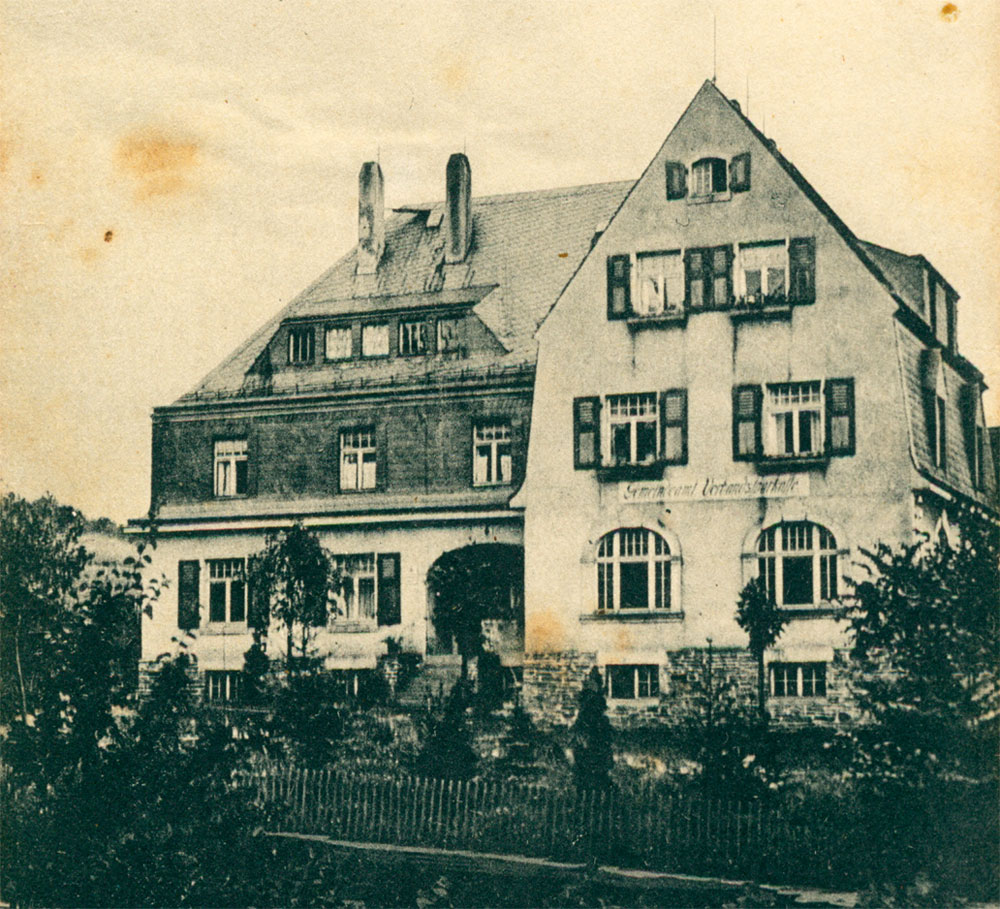 • Großrückerswalde: Klöppelschule, Verbandssparkasse und Gemeindeamt (Ausschnitt Ansichtskarte Verlag R. Schaarschmidt in Leipzig, ca. 1920; Bestand: Historisches Archiv des OSV)