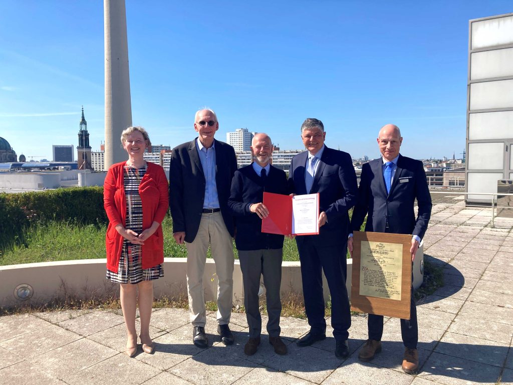 • Über den Dächern Berlins fand die Staffelstabübergabe statt. Der Historiker Klaus-Dieter Marten (2.v.l.) überträgt die Verantwortung für seine Schätze an das OSV-Archivteam und legt sie damit, so Kai Uwe Peter, in "gute, zuverlässige Hände". Erste Projekte sind bereits angedacht. (v.l.n.r.: Britta Weschke (OSV), Klaus-Dieter Marten (ehem. Berliner Sparkasse), Kai Uwe Peter (Sparkassenverband Berlin), Wolfgang Zender (OSV), Ralph Rose (Berliner Sparkasse) : © Historisches Archiv des OSV