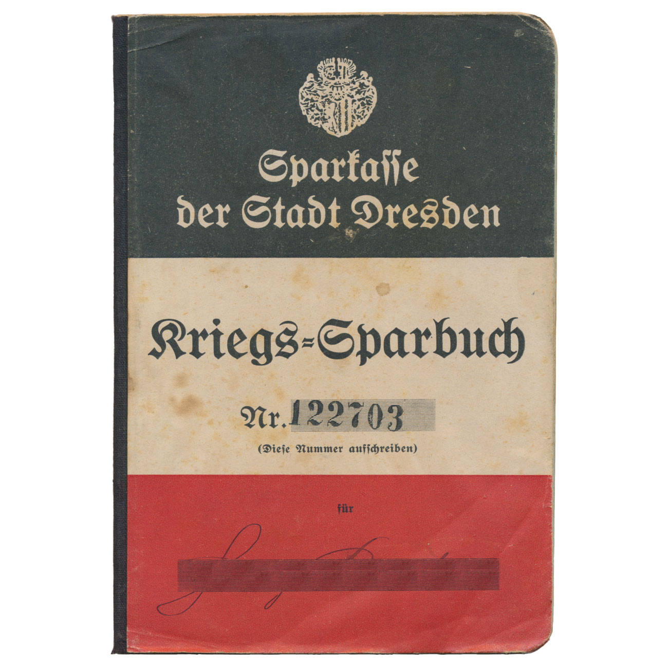 Die Sparkassenbücher waren oft besonders gestaltet, damit die Kundinnen und Kunden ein patriotisches Erinnerungsstück an die Finanzierung des Krieges an der „Heimatfront“ beziehungsweise „Sparfront“ hatten. Die Sparkasse der sächsischen Landeshauptstadt druckte deswegen nicht etwa neue Bücher. Es wurde schlichtweg ein anderes, farbiges Cover auf ein gewöhnliches Sparkassenbuch geklebt. Wir sehen hier die damaligen Nationalfarben des Kaiserreichs, Schwarz-Weiß-Rot.