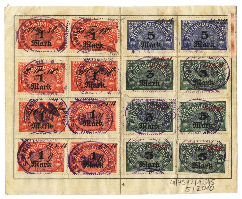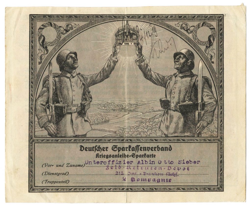 Im Fall des Todes des Soldaten konnte die Auszahlung oder die Herausgabe der Anleihen an jede zur gesetzlichen Hinterbliebenenversorgung berechtigte Person erfolgen. So stand es auch in der Karte, die einstmals Albin Otto Sieber gehörte. Er war Kunde der Gemeindesparkasse in Mittelbach bei Chemnitz. Als Unteroffizier in der 1. Kompanie des Reserve-Infanterie-Regiments 104 wurde er 1916 schwer verletzt. 1917 und 1918 sparte der dann in einer anderen Einheit dienende Sieber insgesamt 43 Mark mit dieser Karte. Kriegssparmarken zu einer, drei und fünf Mark wurden geklebt. Zu sehen sind die unterschiedlichen Marken auf dem zweiten Bild dieses Beitrags.
