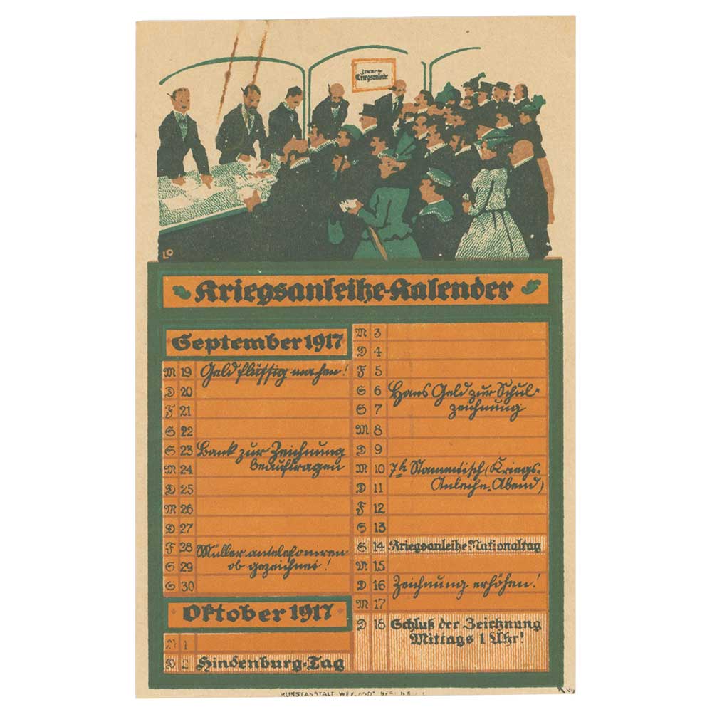 Ich recherchiere nun konkret zu Vorgängerinstituten der oben genannten Sparkasse, um bei dem Thema einen regionalen Bezug herzustellen. Im Depositalbestand finden sich Akten einzelner Vorgängersparkassen. Doch nicht nur Fakten, sondern auch Abbildungen werden benötigt. Werbematerial ist besser geeignet als Schriftgut. Dieser Kriegsanleihe-Kalender liegt in einer Akte der Leutersdorfer Sparkasse. Dargestellt ist der Andrang bei der Zeichnung der siebten Kriegsanleihe im Herbst 1917. „Geld flüssig machen!“, „Bank zur Zeichnung beauftragen“, „Müller antelefonieren ob gezeichnet!“ „Hand Geld zur Schulzeichnung“ „7 h Stammtisch (Kriegsanleihe Abend)“ sowie „Zeichnung erhöhen!“ ist zu lesen. Denn am 18. Oktober war Zeichnungsschluss.