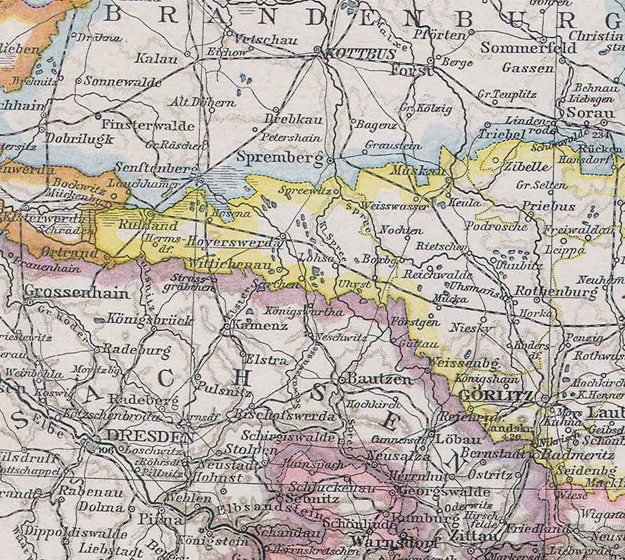 Der Ausschnitt einer Landkarte von 1887 zeigt den Verlauf der Grenze zwischen der preußischen Provinz Schlesien (gelb) und dem Königreich Sachsen. (Karte vermtl. in: Richard Andrees allgemeiner Handatlas; Bestand: Historisches Archiv des OSV)