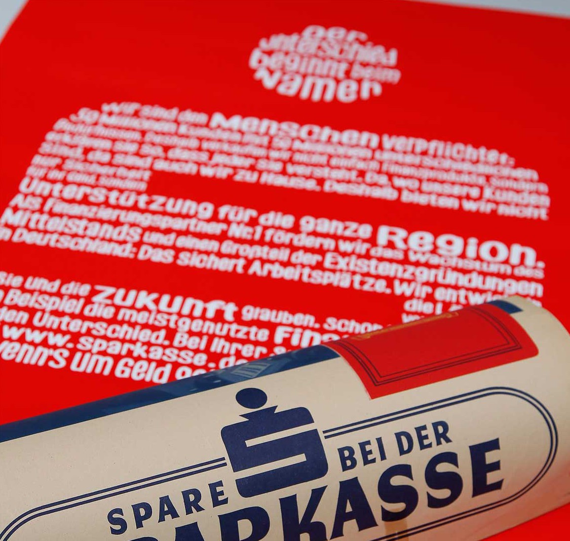 Werfen wir an dieser Stelle noch einmal einen genaueren Blick auf das, wofür die örtlichen Sparkassen sich vor 50 Jahren entscheiden konnten. Einerseits wurden visuelle Konstanten definiert. Dazu gehörten insbesondere das rote Sparkassen-S, der Schriftzug „Sparkasse“, die Hausfarbe „Sparkassenrot“ HKS 13 sowie die Hausschrift Helvetica und natürlich auch der bekannte Sparkassen-Slogan. Im Detail wurden Musterlayouts für Geschäftsvordrucke, wie Briefpapier, Visitenkarten oder das Sparkassenbuch, für Hausbroschüren, wie Geschäftsberichte, Jubiläumsschriften oder Hauszeitschriften, für die Außenwerbung, für Anzeigen, Bildschirmtext und für die Verbundfirmierung kreiert.
