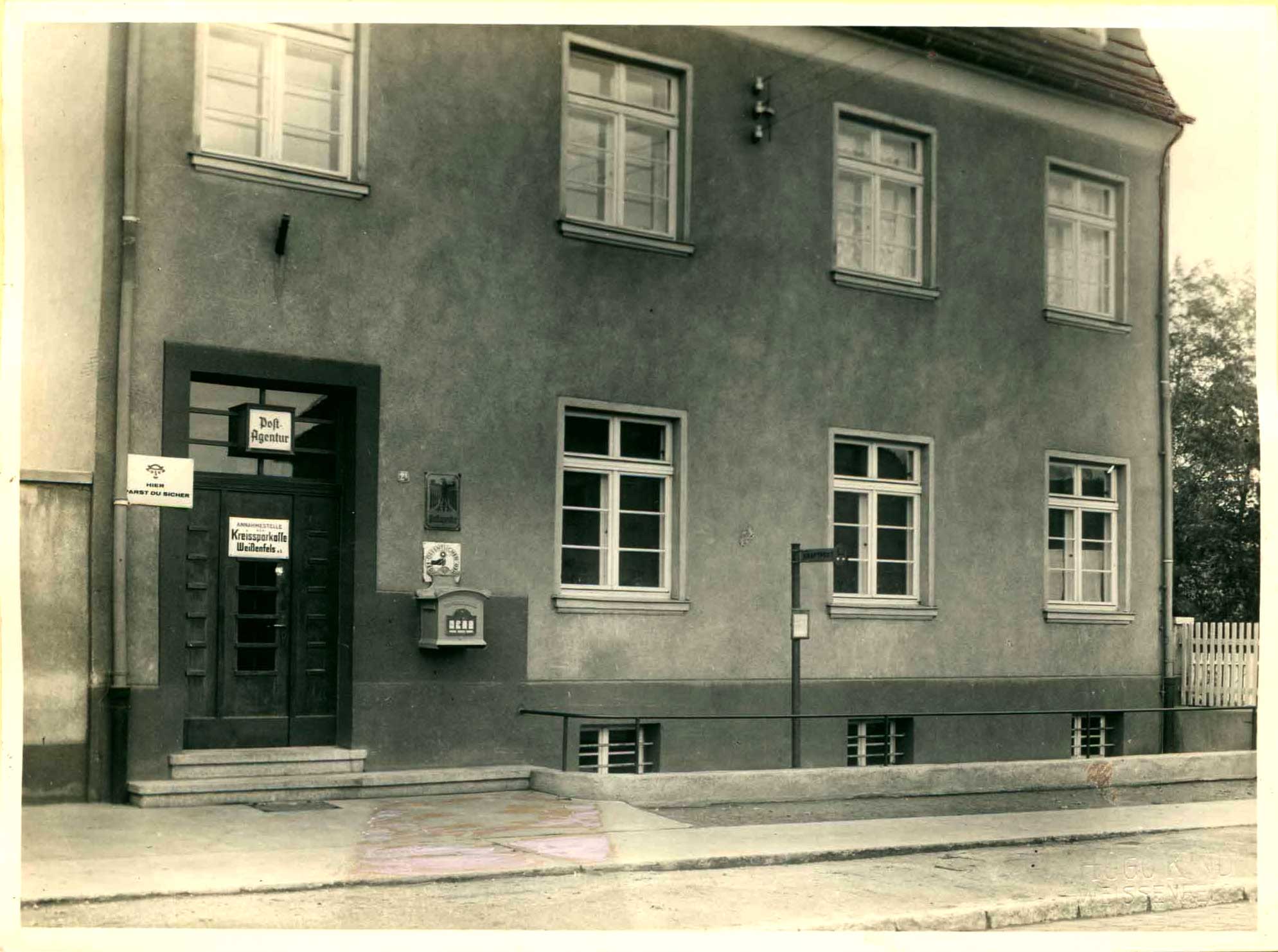 • Foto aus den 1930er-Jahren von der Kreissparkasse Weißenfels mit dem "Hermeskopf"-Schild an der Tür (links im Bild) und dem Zusatz "Hier sparst Du sicher" (Quelle: Kreissparkasse Weißenfels, heute: Sparkasse Burgenlandkreis)