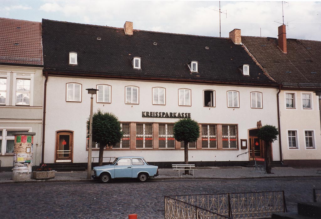 • Auch von außen haben die roten Fensterklebestreifen eine große Signalwirkung. Das Sparkassen-S leuchtet 1990 schon von Weitem den Kunden der Hauptgeschäftsstelle der Kreissparkasse Jessen entgegen. : © Historisches Archiv des OSV