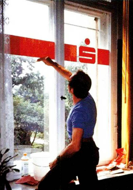 • Die Beklebung der Sparkassenfenster mit rotem Streifen und Sparkassen-S ist eine der werblichen Sofortmaßnahmen. In Suhl kommt das neue Design schon am 16. März 1990 zum Einsatz - also bereits vier Tage vor dem offiziellen Beschluss durch alle 196 DDR-Sparkassen. : © Sparkassen-Werbedienst, Historisches Archiv des OSV