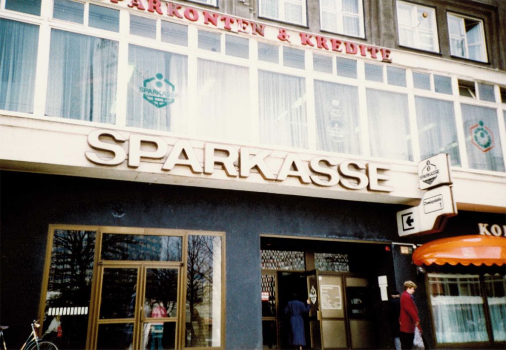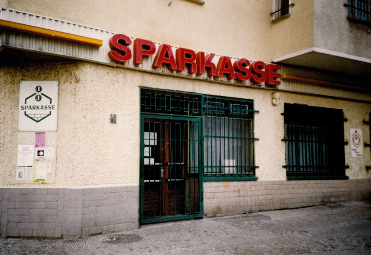 • Überwiegend waren die Zweigstellen im Ostteil Berlins um 1990 mit dem roten Schriftzug „Sparkasse“ versehen, wie hier an der Zweigstelle 44 in der Greifswalder Straße 48 in Berlin-Prenzlauer Berg. : © Historisches Archiv der Berliner Sparkasse