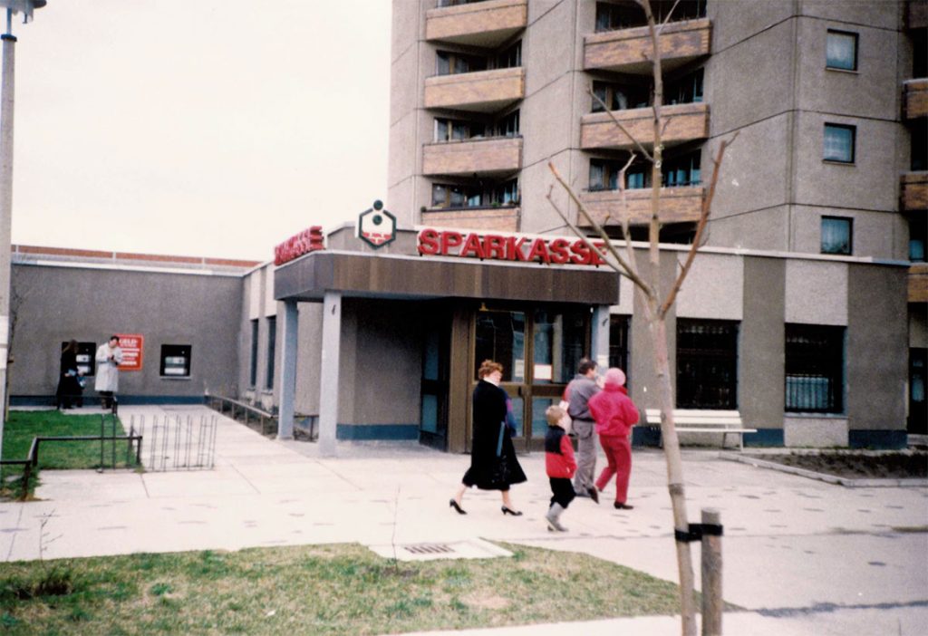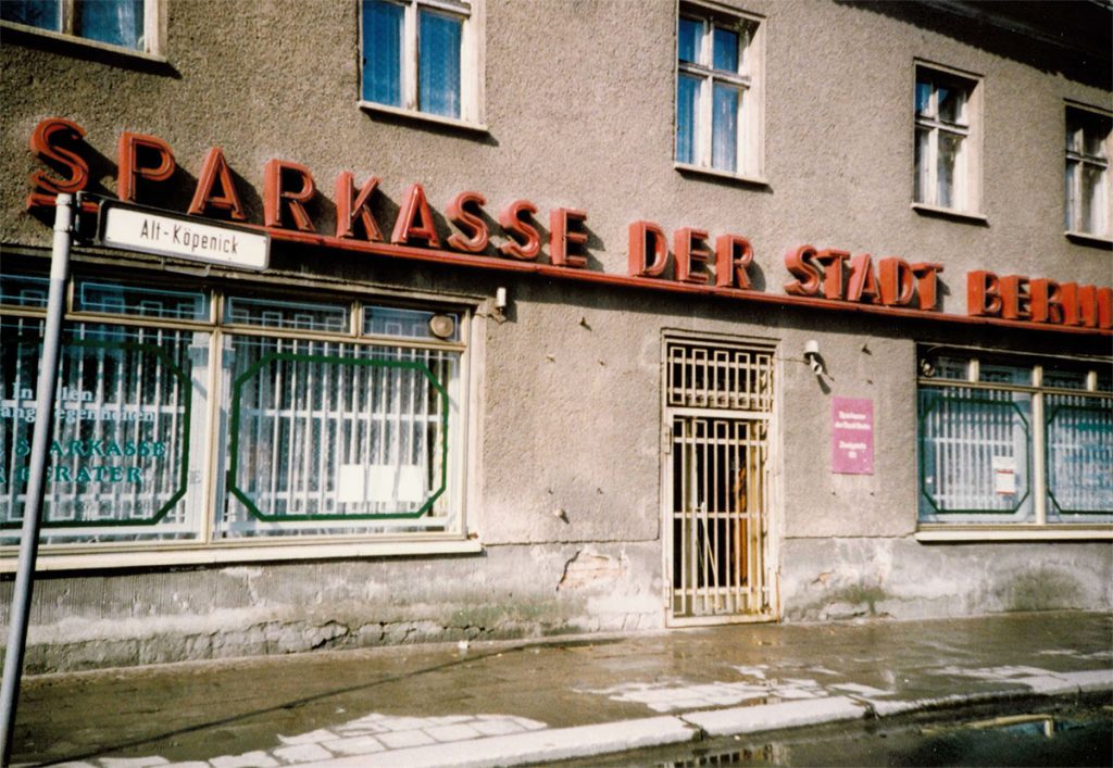 • Zweigstelle 161 mit dem roten Schriftzug „Sparkasse der Stadt Berlin“ in Berlin-Köpenick im Frühjahr 1990. : © Historisches Archiv der Berliner Sparkasse