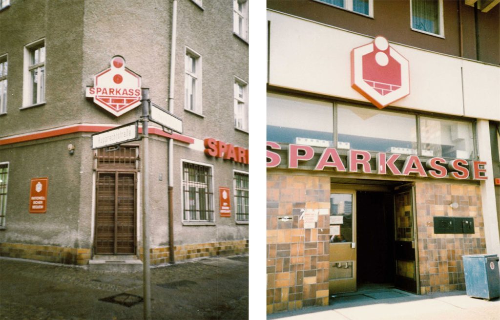 • Das DDR-Sparkassenlogo an der Zweigstelle 174 in der Rupprechtstraße 35 in Berlin-Lichtenberg (links) ist 1990 direkt über der Eingangstür angebracht. Das DDR-Sparkassenlogo an der Zweigstelle 170 am Anton-Saefkow-Platz 13 in Berlin-Lichtenberg (rechts) weist eine weitere Gestaltungsvariante auf. : © Historisches Archiv des OSV