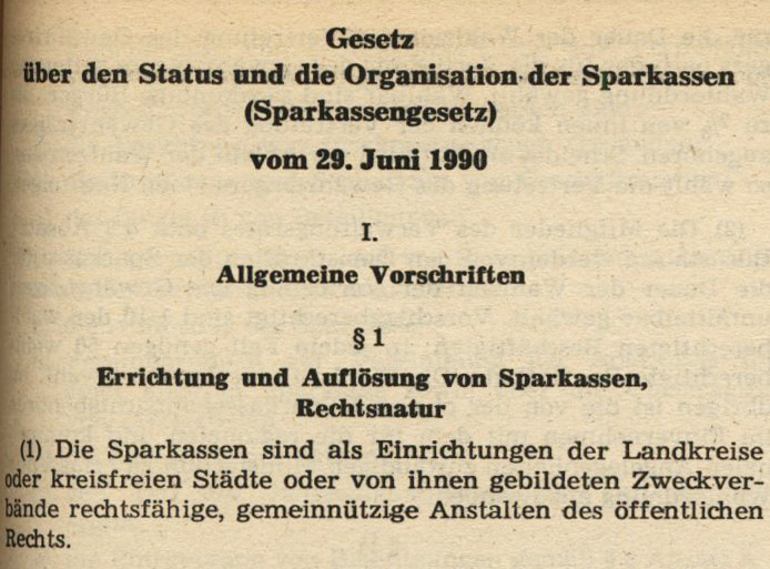 **** Gesetz über den Status und die Organisation der Sparkassen (Sparkassengesetz) vom 29. Juni 1990, § 2 (1), in: Gesetzblatt der DDR, Teil I, Nr. 40, 12.07.1990, S. 567