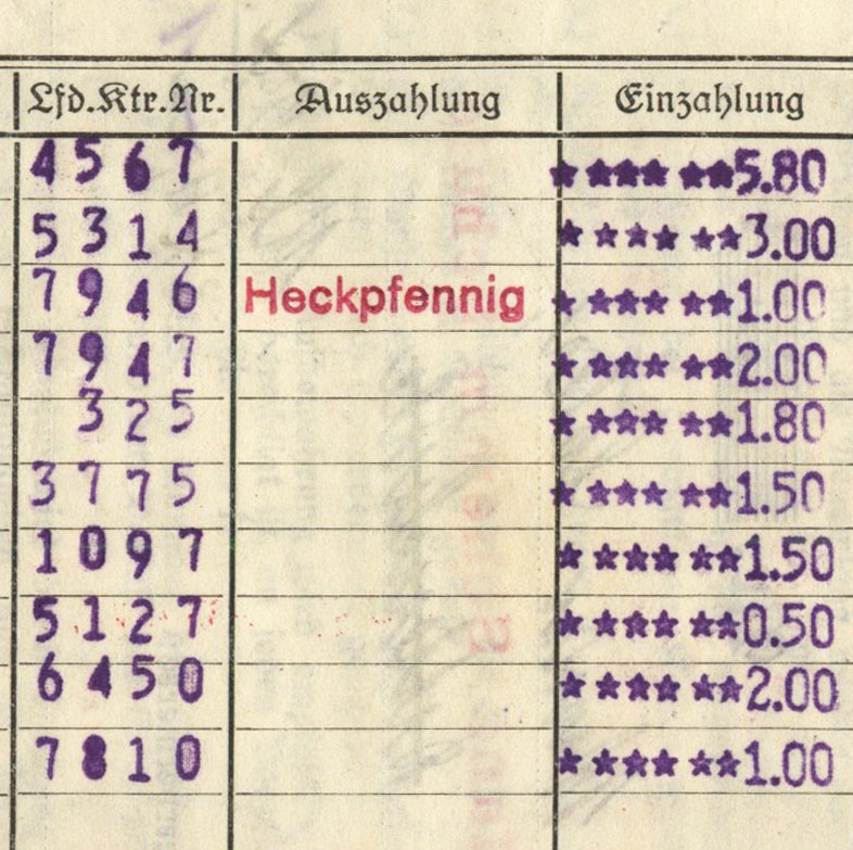 Anfang 1934 führte die Stadtsparkasse Zwickau in den örtlichen Volksschulen das Schulsparen ein. So wurde auch Werner aus der Dittesschule im Ortsteil Pölbitz Sparer. Ihm gehörte dieses Schulsparbuch, das er vom Frühjahr 1934 bis zum Frühjahr 1939 nutzte. 1935 wurde seine Schule nach dem bayerischen Gauleiter und Kultusminister Hans Schemm benannt. Der Schüler sparte nicht nur eifrig, sondern ließ sich auch Geld auszahlen. Letztlich verblieb nur die sogenannte Heckmark als Guthaben auf dem Sparbuch, denn diese war bis Ostern 1941 gesperrt. Davon zeugt ein gestempelter Vermerk der Stadtsparkasse. Vor Ostern 1934 hat Werner diese eine Reichsmark von der Sparkasse geschenkt bekommen. Sie wurde auch als Heckpfennig bezeichnet, wie Abbildung 2 zeigt. Im Volksglauben war eine Heckmünze ein Geldstück, das sich von allein vermehrte. Deswegen durfte man diese Zaubermünze nicht ausgeben.