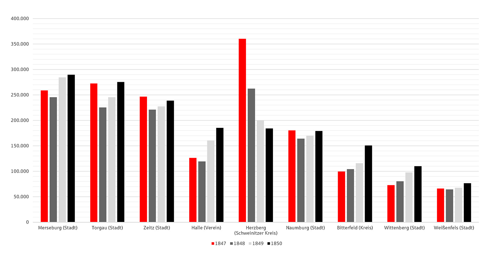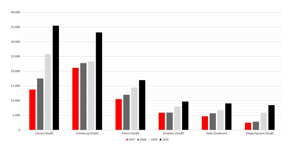 Die Unterlagen der Aufsichtsbehörden sind eine wertvolle Quelle, wenn man sich mit der älteren Sparkassengeschichte beschäftigt. So sind zum Beispiel im Landesarchiv Sachsen-Anhalt in Magdeburg Akten des Oberpräsidenten der Provinz Sachsen vorhanden, in denen die jährlichen Geschäftsdaten sämtlicher Sparkassen des Landesteils des Königreichs Preußen für die Mitte des 19. Jahrhunderts stehen. Das war für die Geldinstitute eine schwierige Zeit. Revolutionäre Ereignisse wirkten sich damals auf die Einlagenentwicklung aus. Ins Auge fällt, dass unter den 15 Sparkassen in den hier abgebildeten zwei Diagrammen eine besonders hart getroffen wurde. Die Hintergründe habe ich im Rahmen einer Auftragsarbeit erforscht. Wichtige Informationen fanden sich im Merseburger Standort des Landesarchis sowie im Geheimen Preußischen Staatsarchiv in Berlin. Auch die Publikation von Karl Pallas zur Geschichte Herzbergs aus dem Jahr 1901 war sehr nützlich. Dieses Werk steht in der Berliner Staatsbibliothek.