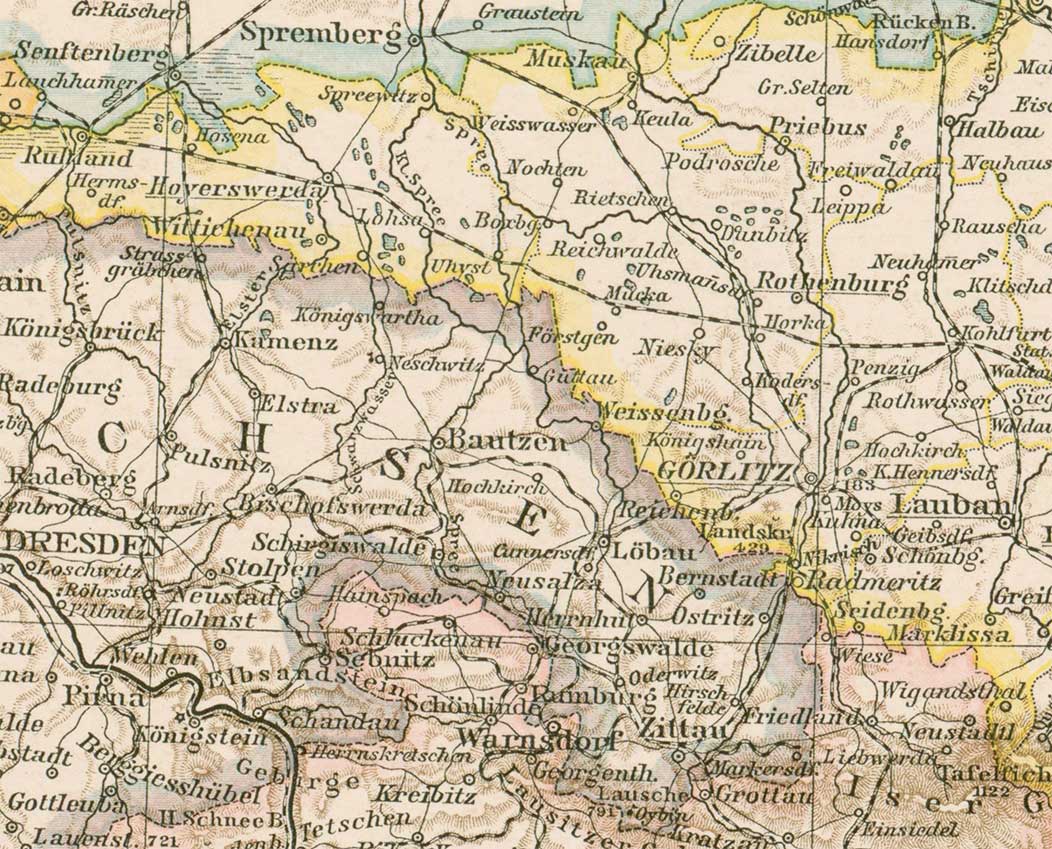Wie Sie auf der abgebildeten Landkarte erkennen können, war ein Teil des heutigen Freistaates Sachsen in früheren Zeiten nicht sächsisch. Gelb markiert ist das Gebiet der preußischen Provinz Schlesien, die bis 1945 existierte. Zu ihr gehörte der Norden der Oberlausitz, den das Königreich Sachsen 1815 abtreten musste. Sparkassen wurden auf beiden Seiten der Landesgrenze gegründet. So entstand etwa mit der Stadtsparkasse Zittau am 28. März 1825 die erste kommunale Sparkasse Sachsens.