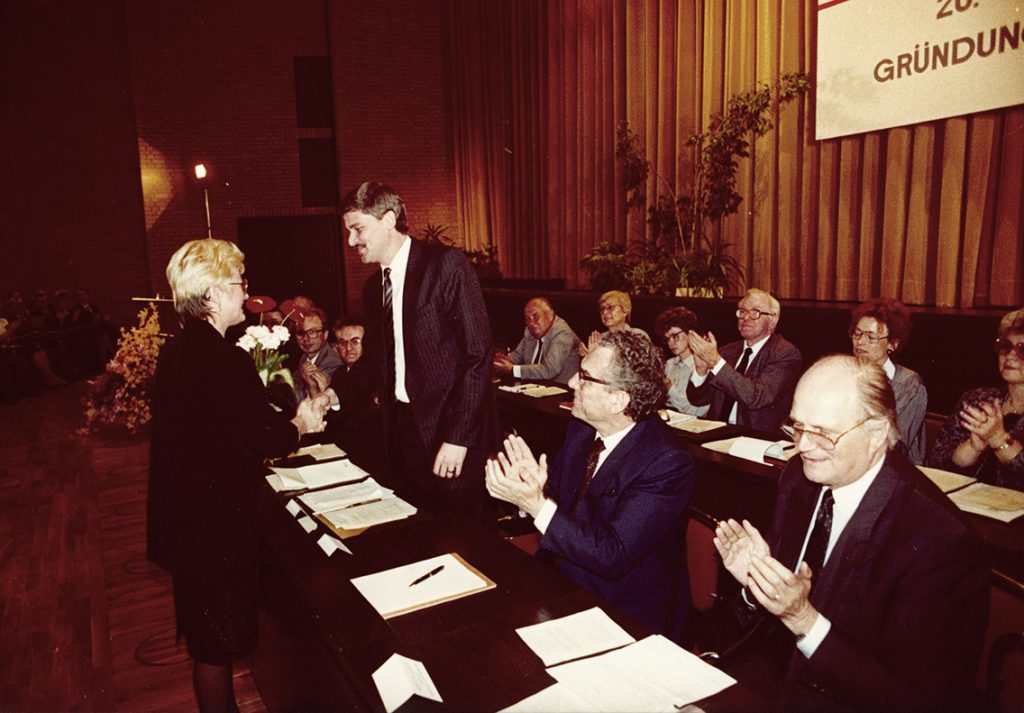 1952 waren die Länder und die regionalen Sparkassenverbände in der DDR abgeschafft worden. Erst vor 30 Jahren konnten die ostdeutschen Sparkassen sich aus der Abhängigkeit von der Staatsbank lösen und eine unabhängige Interessenvertretung ins Leben rufen. Am 20. März 1990 fand die Gründungsversammlung des Sparkassenverbandes der DDR statt. Eingeladen waren die 196 Direktoren und Direktorinnen* der Sparkassen ins Tagungszentrum des Ministeriums für Nationale Verteidigung im Norden Strausbergs bei Berlin. Auch der für die Sparkassenaufsicht zuständige Präsident der Staatsbank, Horst Kaminsky, war anwesend. Der Präsident des Deutschen Sparkassen- und Giroverbandes, Dr. h. c. Helmut Geiger, der die Gründung des Sparkassenverbandes im Osten Deutschlands tatkräftig unterstützte, war Ehrengast.
