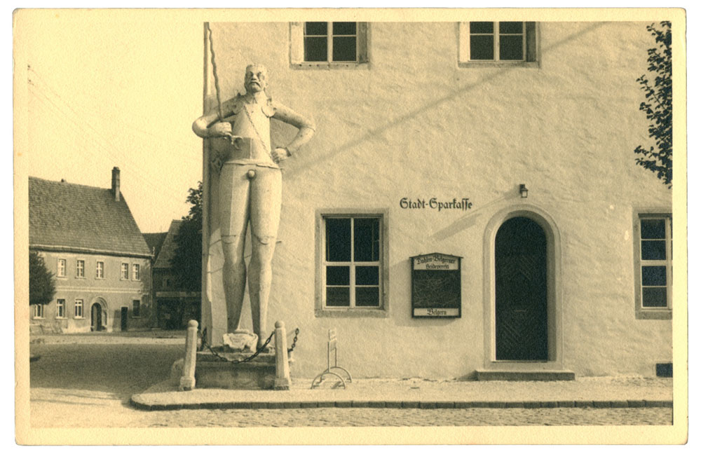 Der etwas unproportionierte Roland von Belgern mit seinem auffälligen Hosenknopf wurde nach dem Rathausneubau 1610 aus Sandstein errichtet. Zuvor stand dort ein Roland aus Holz. (Abb. Ansichtskarte Verlag M. Marquardt in Dahlen, um 1930)