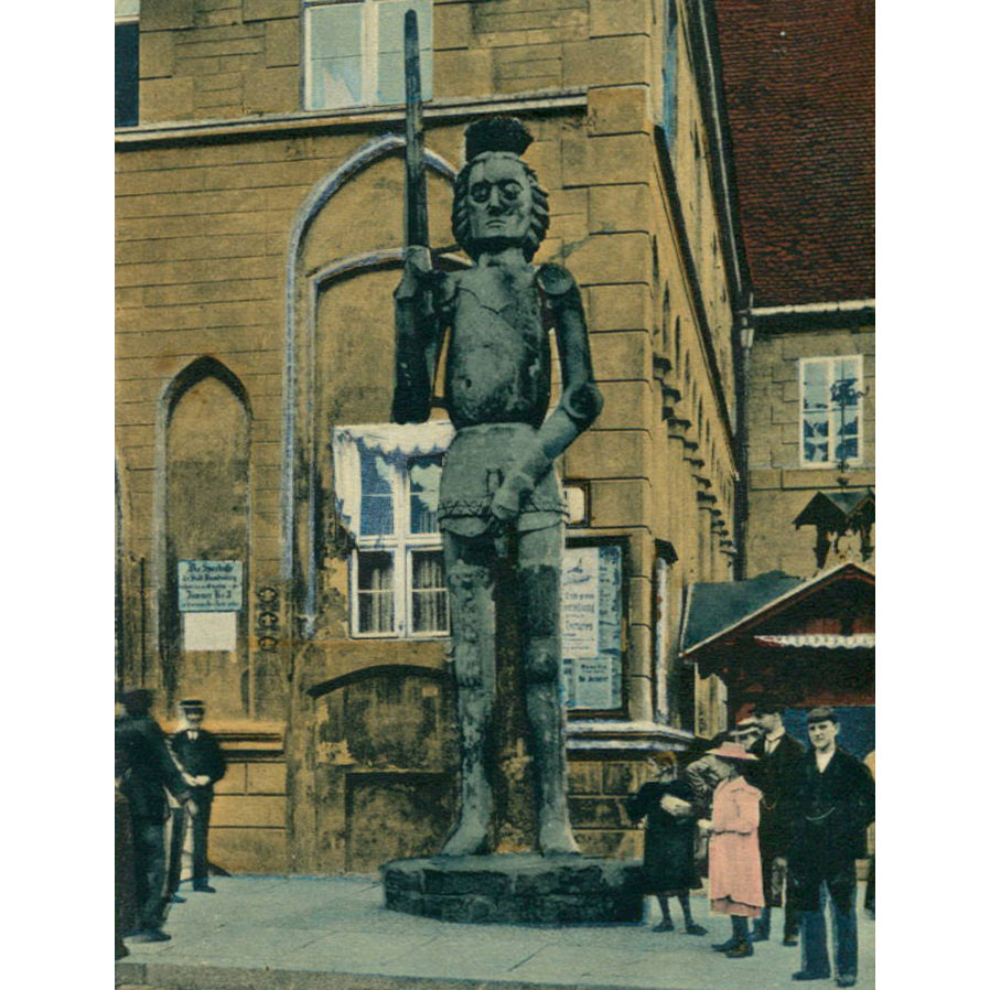 Eine Sehenswürdigkeit von Brandenburg ist er auch heute noch, der Roland aus dem Jahr 1474. Eine Kopie hat es 1905 sogar bis vor das Märkische Museum in Berlin geschafft. Als das Foto für das abgebildete Postkartenmotiv geschossen wurde, stand das Original gerade vor dem Neustädtischen Rathaus der Havelstadt. Vom Platz am Altstädtischen Rathaus war die Figur hierher 1716 mit Genehmigung des Soldatenkönigs Friedrich Wilhelm I. versetzt worden, weil sie die Soldaten beim Exerzieren störte. Erst nach dem Zweiten Weltkrieg, in dem das neue Rathaus zerstört wurde, kam die Statue an ihren heutigen Standort in der Altstadt.
