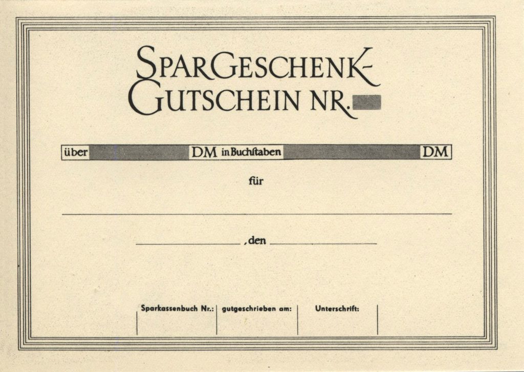 Auch die Sparkassen nutzten mehr als 100 Jahre später diese Gelegenheit, um die Spartätigkeit ihrer Kundschaft – auch der potenziellen – anzuregen. Mit der Ausgabe von schön gestalteten Geschenkgutscheinen seit Anfang der 1930er-Jahre war ein weiteres Werbemittel entwickelt worden, das sich bald neben Plakaten, Stundenplänen und Lesezeichen behaupten konnte. Hatte es doch den Vorteil, mit einem kleinen finanziellen Anreiz ausgestattet zu sein.