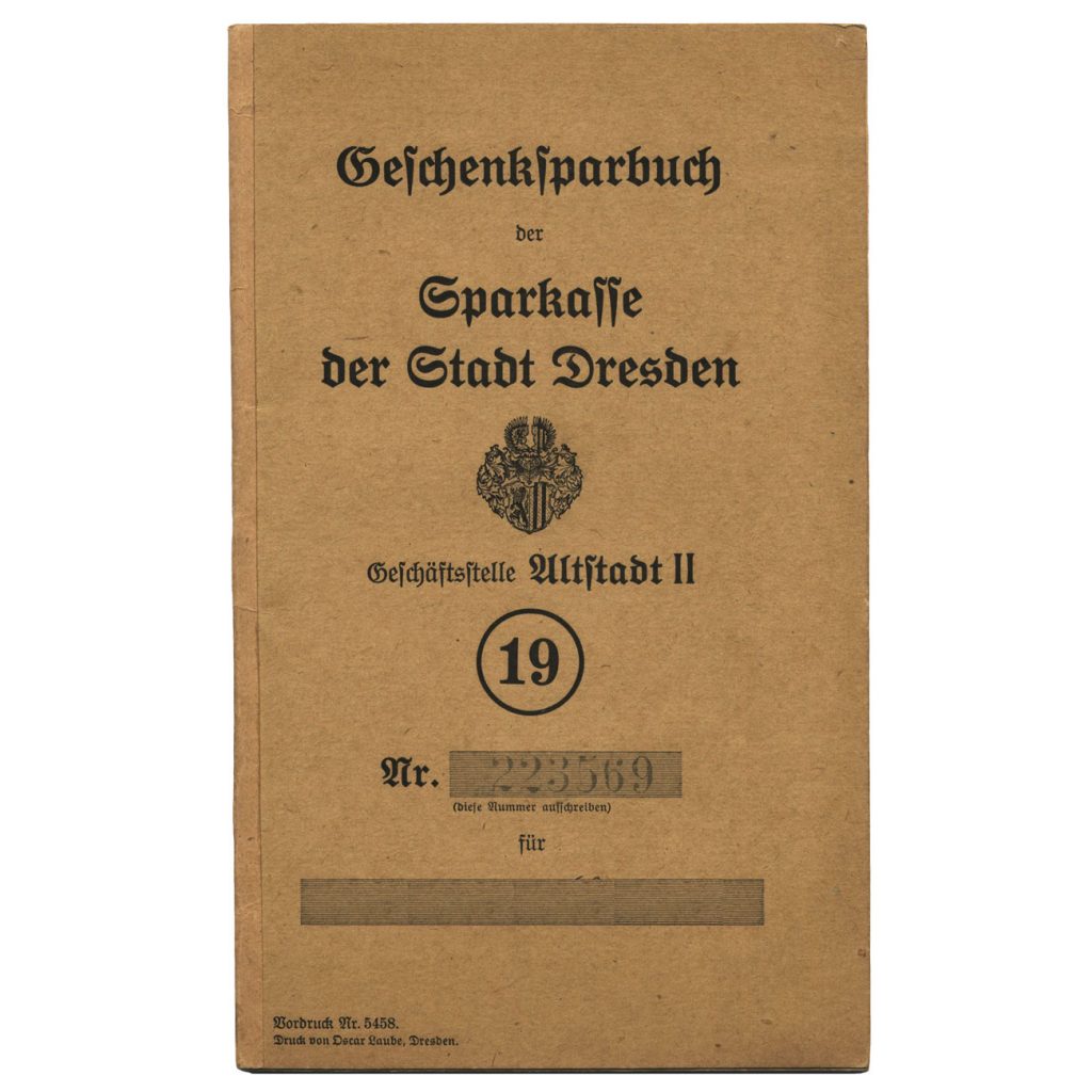 Zur Förderung des Sparsinns war hingegen das abgebildete Buch gedacht. Es wurde in der Geschäftsstelle Ecke Schießstraße/ Landhausstraße ausgestellt. Drei Mark Startguthaben erhielt ein Junge zum Schulanfang im September 1921. Über den Betrag und die Zinsen sollte er jedoch erst bei Volljährigkeit mit 21 Jahren verfügen dürfen. Dies war als Anreiz gedacht, Kunde der Sparkasse zu bleiben und natürlich fleißig zu sparen. Nicht nur bei der Stadtsparkasse Dresden war diese Werbemaßnahme früher üblich. Einen Anlass für ein Geschenk stellte übrigens auch die Geburt dar.