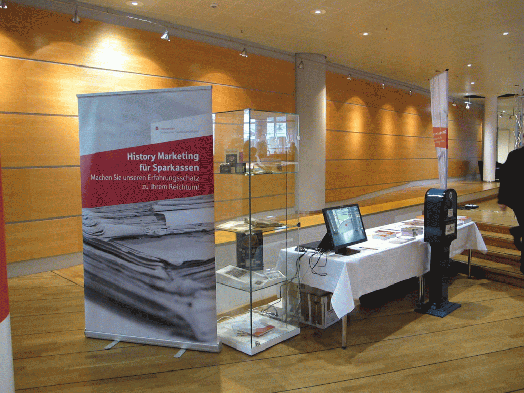 Deshalb standen wir, die drei Mitarbeiter des Archivs, mit einer Vielzahl von Archivalien und History-Marketing-Produkten auf der Messe bereit. Bereit mit den „Sparkässlern“ in Kontakt zu treten und sich über die Vorteile von Geschichtsmarketing auszutauschen.