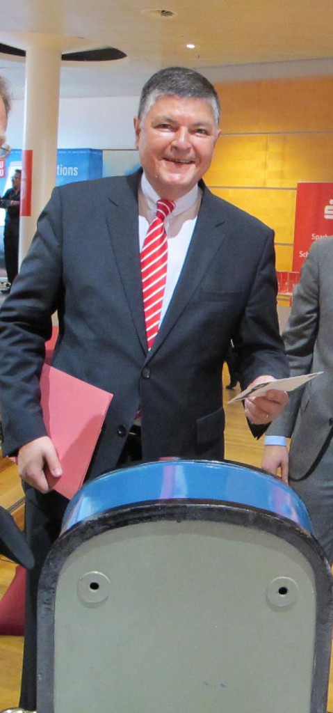 Einer der ersten, der meine Kurbel benutzte, war der Präsident des Deutschen Sparkassen- und Giroverbandes, Georg Fahrenschon. Auf dem Weg zur Aula, kurz vor seiner Rede, besuchte er gemeinsam mit dem Präsidenten des Ostdeutschen Sparkassenverbandes, Michael Ermrich, unseren Messestand und ließ sich meine Funktionsweise und Aufgabe im Schulsparwesen längst vergangener Zeiten erklären. Seit meiner Reparatur vor einem Jahr funktioniere ich natürlich einwandfrei und stempele alle Schulsparkarten zur höchsten Zufriedenheit, wenn ich das in aller Bescheidenheit mal sagen darf. Aber ich schweife ab …