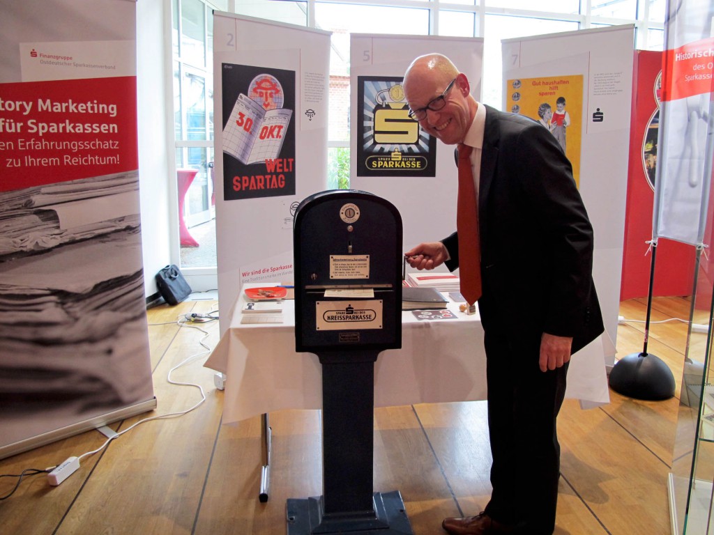 Als erster konnte Verbandsgeschäftsführer Wolfgang Zender den Automaten testen. Auf dem Weg zu seinem Eröffnungsvortrag stoppte er an unserem Messestand und ließ sich gern in die „Geheimnisse“ des Kleinsparwesens und der Sparkassengeschichte einweihen.