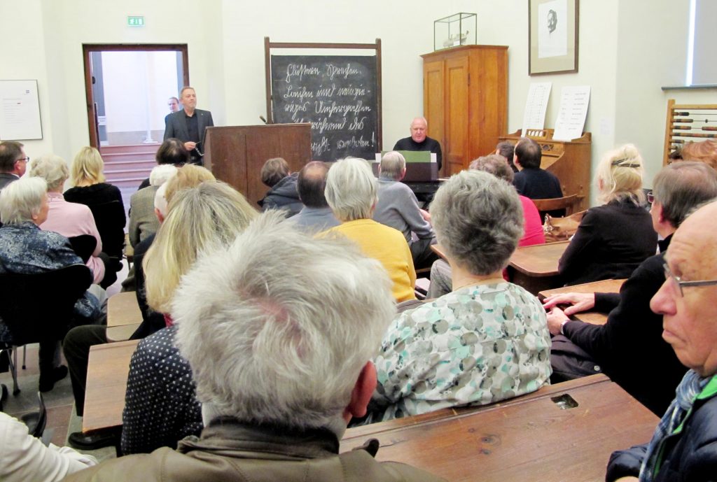• Auf über 100 Jahre alten Schulbänken lauschten die zahlreich erschienenen Gäste den Grußworten des Amt. Direktors Städtische Museen Junge Kunst und Viadrina. : © Historisches Archiv des OSV