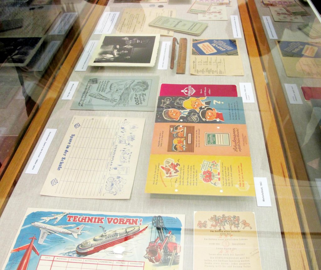 • In den Vitrinen konnte man die bunte Welt der Schulsparwerbung bestaunen. Vieles davon ist aus unserem Archiv. : © Historisches Archiv des OSV