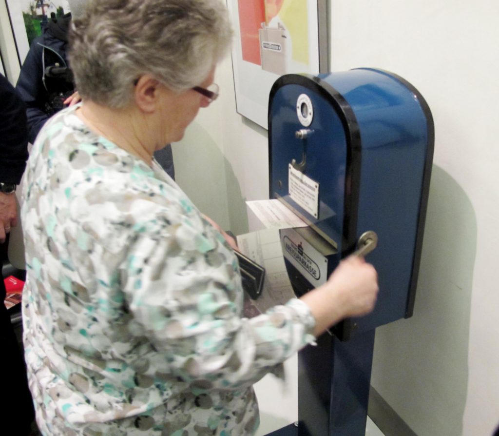 Als besonderer Magnet an unserem Stand erwies sich der Sparautomat. Sparkarte einlegen, 2-Cent einwerfen, einmal an der Kurbel drehen und fertig – die Karte war gestempelt. Zur Hochzeit der Sparautomaten in den 1920er- und 30er-Jahren füllten vor allem die Kinder ihre Karten Stempel um Stempel. Diese brachten sie dann  ausgefüllt zur Sparkasse, wo ihnen das Geld auf ihrem Sparbuch gutgeschrieben wurde. Natürlich war die Währung damals eine andere.