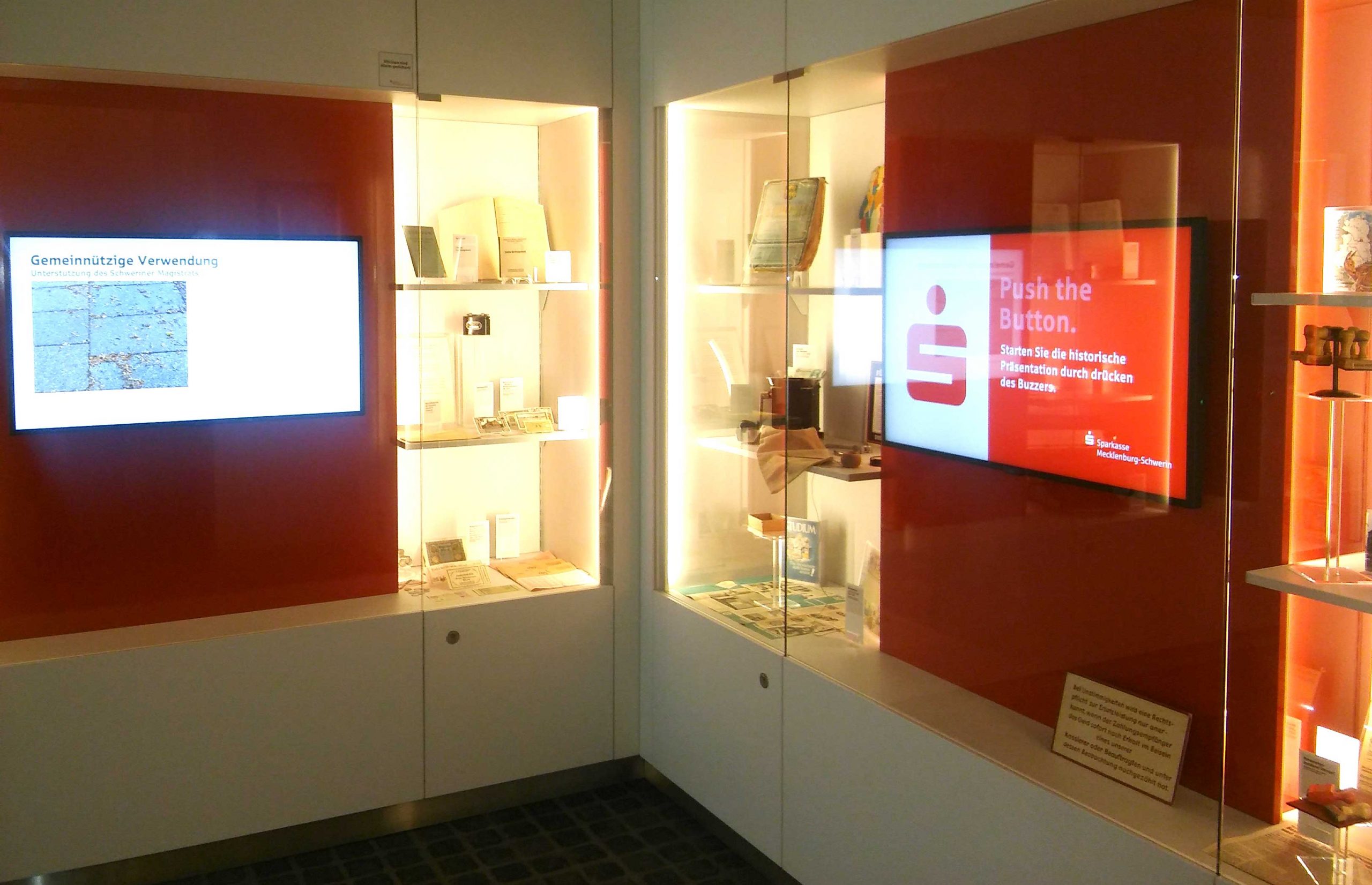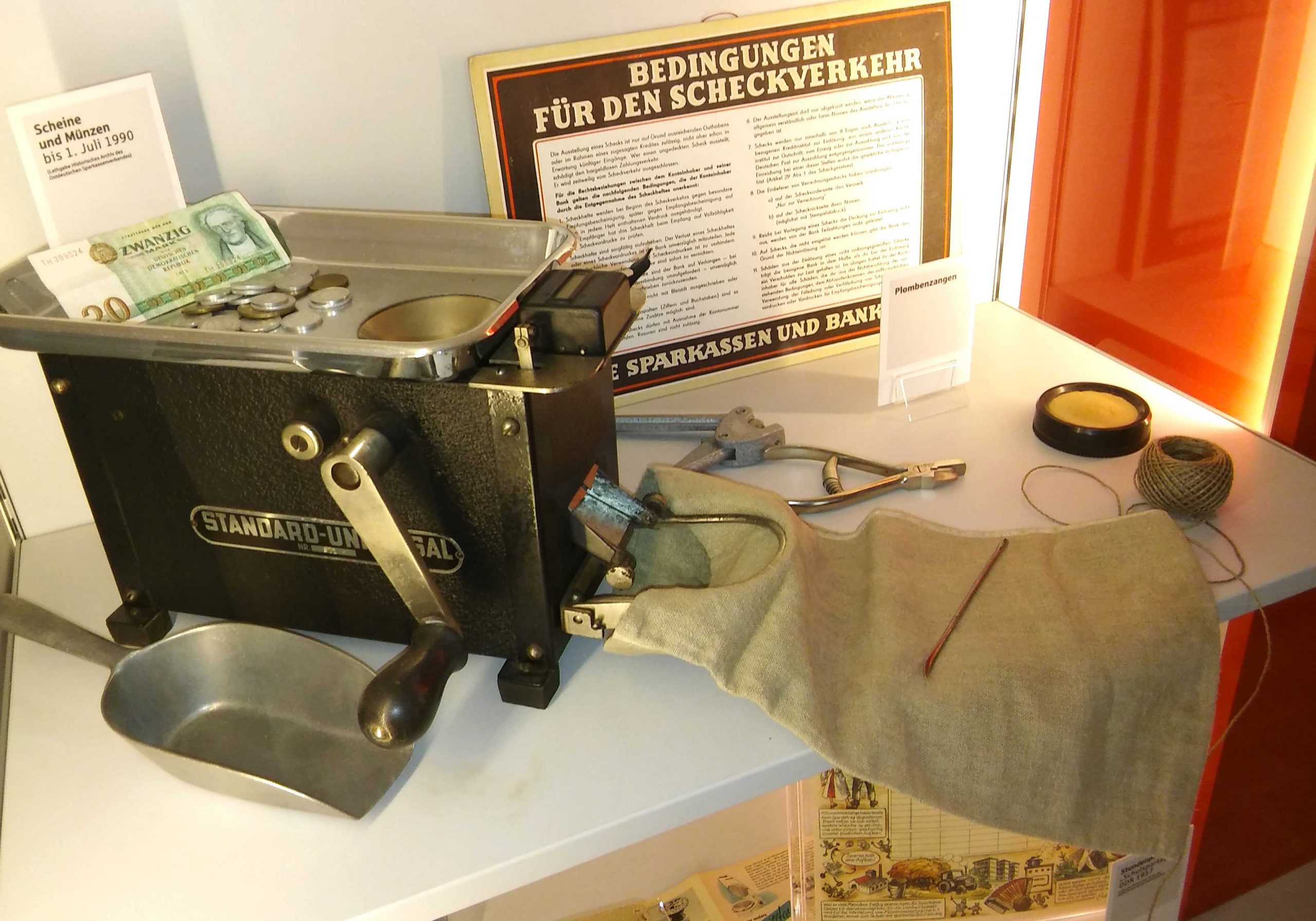 Wenn Sie mögen, dann schauen Sie sich unbedingt auch die Ausstellung an. Die Vitrinen zeigen interessante sparkassenhistorische Objekte aus den Sammlungen der Sparkasse selbst und des Ostdeutschen Sparkassenverbandes, wie zum Beispiel Werbung längst vergangener Zeiten, Spiele, Maschinen, frühere Möglichkeiten der Geldaufbewahrung oder auch das Muster der DDR-Geldkarte. Schön ist, dass man im Ausstellungsraum auf der eigenen Reise in die Geschichte auch filmisch begleitet wird.