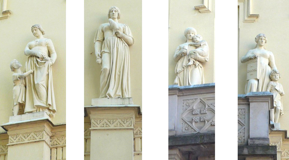 Auf der Seite der Puschkinstraße, 1856 noch Königstraße, prägen zwei Figuren die Fassade, welche die Klientel darstellen und gleichzeitig typisch waren für Schwerin und Umgebung: der ländliche Arbeiter und der Handwerker. Die meisten Menschen lebten noch bis ins frühe 20. Jahrhundert hinein in Mecklenburg-Schwerin von der Land- und Forstwirtschaft oder aber von der Fischerei. 1901 kam über dem Eingang eine letzte Skulptur von Ludwig Brunow hinzu: die Gelehrsamkeit. Damit haben wir insgesamt sieben Symbole, die eng mit der Sparkassenidee verbunden sind und wofür Sparkassen auch heute noch stehen.
