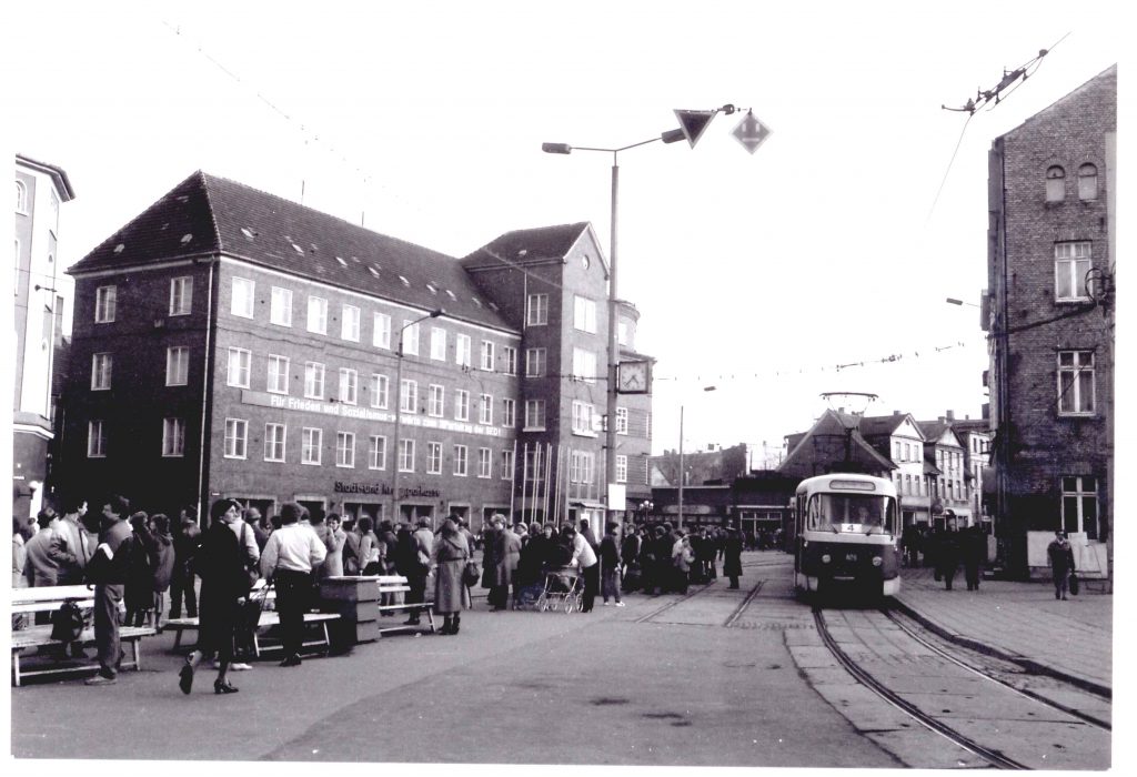 Wenn wir nun die August-Bebel-Straße entlanglaufen und rechts auf die Gaußstraße abbiegen, führt uns das geradewegs auf die Schelfstraße, beginnende Puschkinstraße. Wieder nach rechts gewandt, können wir unser Ziel schon sehen, die