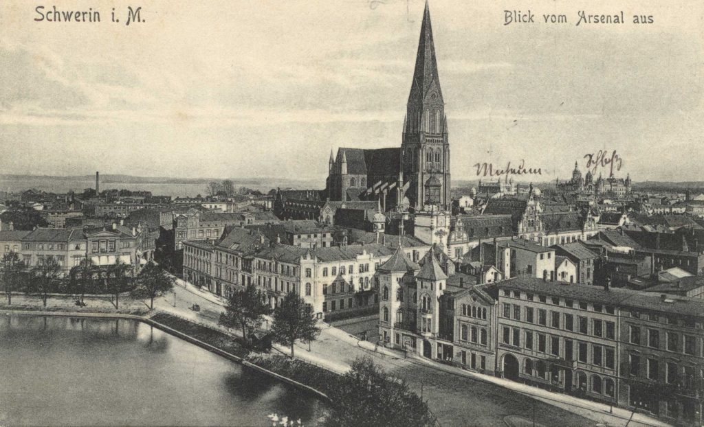 Wenn Sie den Dom besucht und ausgiebig bewundert haben, dann lassen Sie uns die Bischofstraße weitergehen und auf der Friedrichstraße links abbiegen. Wir stehen nun auf der Arsenalstraße und haben den Pfaffenteich, umgeben von zahlreichen denkmalgeschützten Gebäuden, vor uns. Eine Pracht. Und bevor wir nun die August-Bebel-Straße entlangschlendern, könnten Sie einen weiteren Abstecher in die Arsenalstraße machen. Das Haus Nummer acht beherbergte zwischen 1923 und 1945 die Girozentrale Mecklenburg, eine Zweigstelle der Hannoverschen Girozentrale. Davor war es ein hochherrschaftlicher Hotelkomplex: Stern’s Hotel. 1848 wurde es eröffnet und empfing bis zum Umbau prominente Gäste, wie Richard Wagner oder Fritz Reuter. Nach 1945 fungierte es als Haus der Kultur und noch heute wird es als Kulturzentrum genutzt.