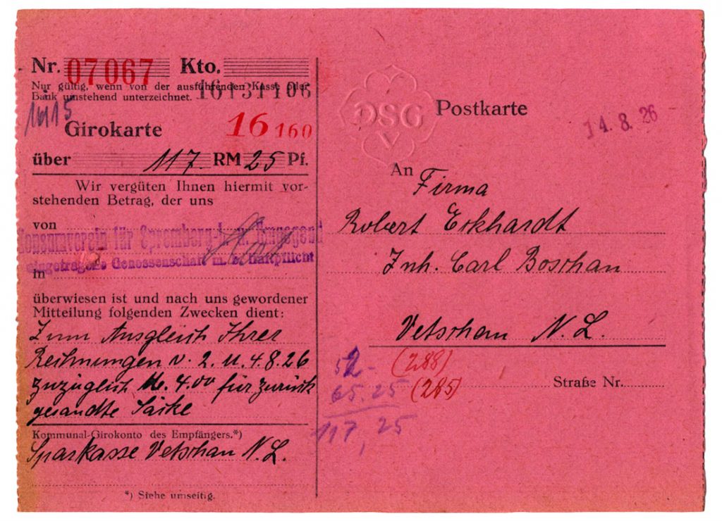 Die fälligen Rechnungsbeträge für die Waren wollte das Unternehmen gern überwiesen bekommen. Auch der Konsumverein für Spremberg und Umgebung war damals Kunde und bezahlte seine Rechnungen per Überweisung. In Zeiten ohne Internet, PCs und Smartphones wurde der Empfänger per Benachrichtigungskarte informiert, dass eine Gutschrift aufs Girokonto erfolgt war. Schon seit 1916 bot die Stadtsparkasse Vetschau den bargeldlosen Zahlungsverkehr an, der nicht nur Geschäftsleuten von Nutzen war. Heute ist in Vetschau die Sparkasse Niederlausitz vor Ort und betreut zahlreiche Girokonten der Menschen in der Region.