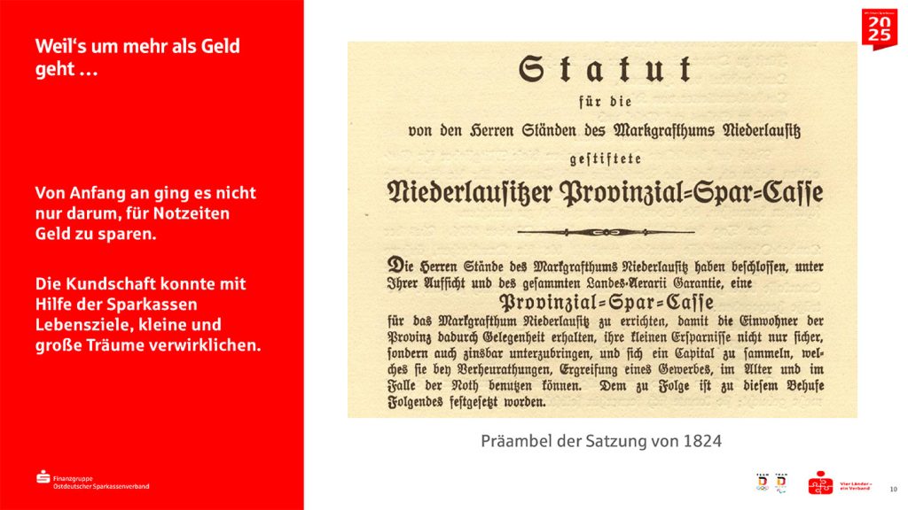 Auszubildenden erkläre ich bei Einführungsseminaren gern, sie sollten mindestens im Kopf behalten, seit wann es ihre Sparkasse vor Ort gibt und was das Sparkassenlogo mit dem Punkt bedeutet. Es gibt aber noch viel mehr wichtige Inhalte, etwa das gesellschaftliche Engagement, das Sparkassen seit jeher auszeichnet. Von Anfang an ging es um mehr als Geld. Die Kundschaft konnte mit Hilfe der Sparkassen schon früher kleine und große Träume verwirklichen. Das machte ich heute besonders deutlich.