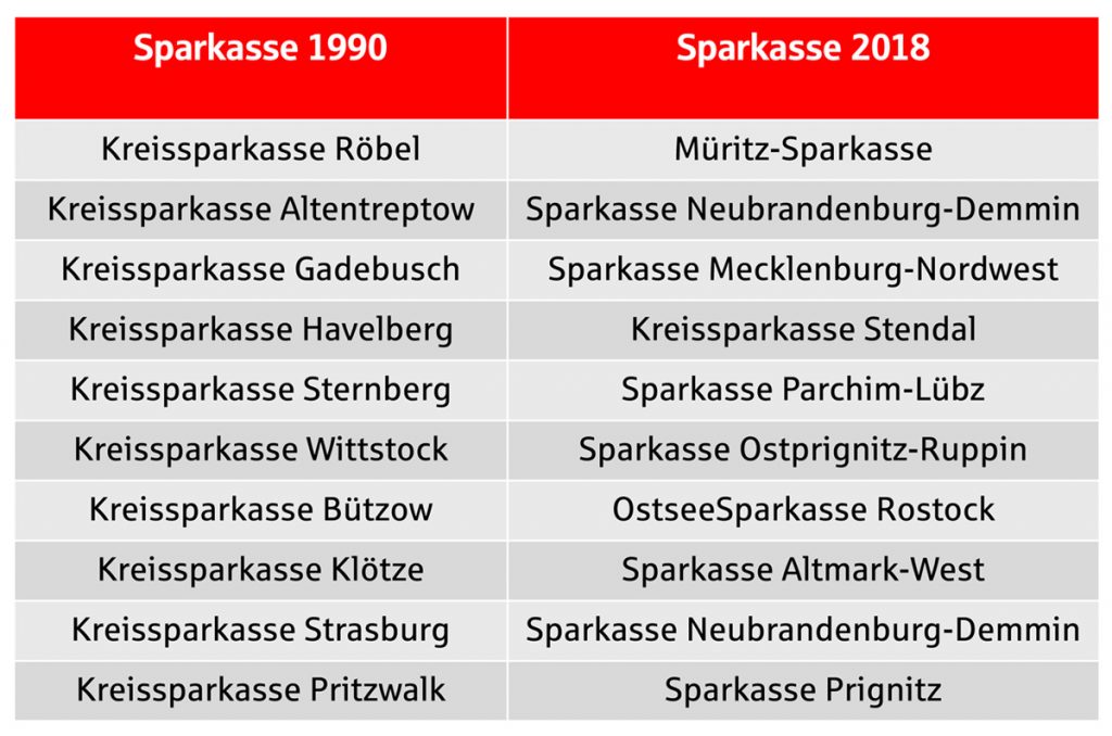 Die zehn kleinsten Sparkassen verschwanden in der ersten Hälfte der 1990er-Jahre von der Bildfläche. Heute sind die rechts aufgelisteten Sparkassen vor Ort zuständig. Darunter ist die OstseeSparkasse Rostock sogar das größte Institut in Mecklenburg-Vorpommern. Sie wurde 1994 durch den Zusammenschluss der Kreissparkasse Bad Doberan mit den Sparkassen Teterow, Rostock und Güstrow gegründet. In der letztgenannten war kurz zuvor die Kreissparkasse Bützow aufgegangen.