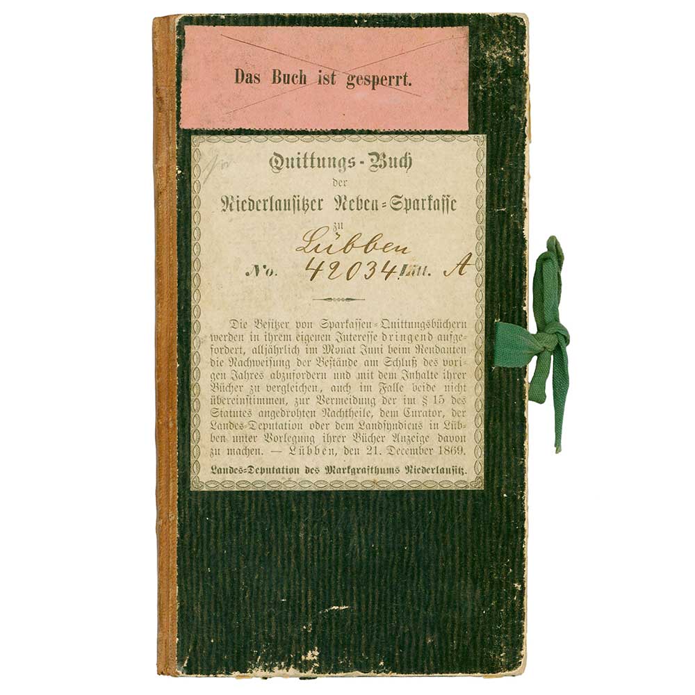 Zwei Aufkleber befinden sich auf dem Deckel. Ausgestellt wurde das Quittungsbuch 1890 bei der Geschäftsstelle der Hauptsparkasse der Niederlausitz in Lübben. Das war die Neben-Sparkasse A. Zwei Jahre später erfolgte auf Grundlage eines Amtsgerichtsbeschlusses ein vorübergehender Sperrvermerk für Auszahlungen.
