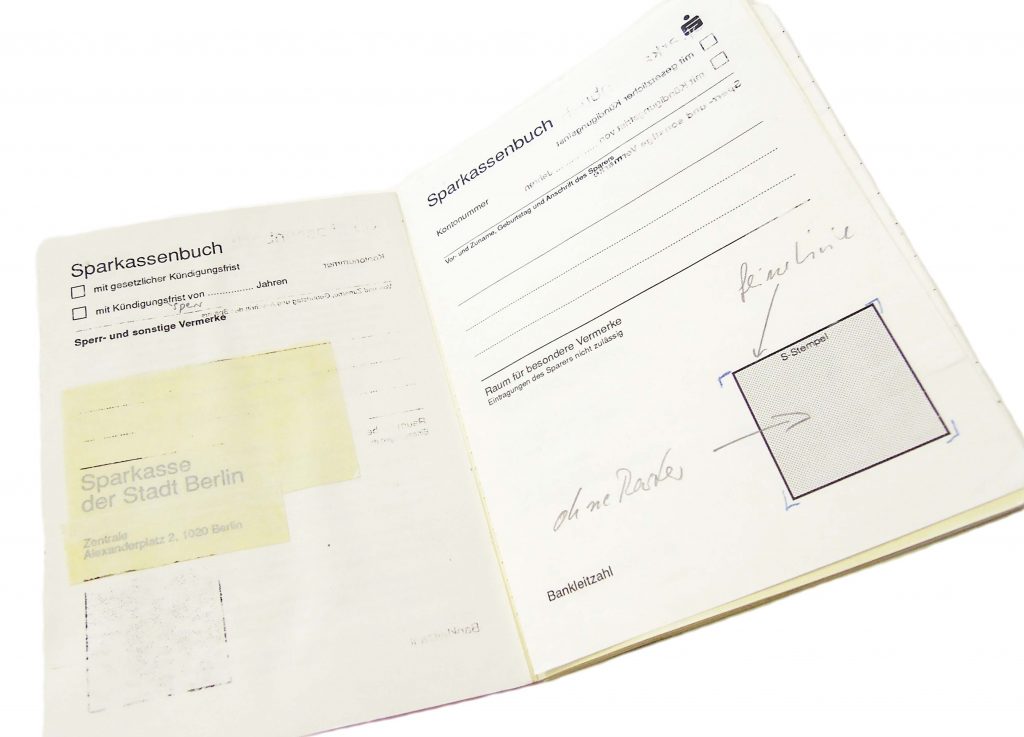 ***Der große Bedarf an Sparbüchern ergibt sich u. a. aus der starken Zunahme der Spareinlagen im 1. Halbjahr 1990, von denen 59 % Buchspareinlagen sind. Insgesamt wird in dem Jahr ein Zuwachs von über 1,5 Mio. Buchsparkonten verzeichnet. Vor der Währungsunion erhalten v. a. Kinder neue Buchsparkonten. Sie werden angelegt, um den für die nach dem 1. Juli 1976 Geborenen festgesetzten Betrag der 1:1-Umstellungen in Höhe von 2000 DM erhalten zu können. Vgl. dazu: Geiger, Walter ; Günther, Hans Georg: Neugestaltung des ostdeutschen Sparkassenwesens 1990 bis 1995, Stuttgart 1998, S. 133, 308.