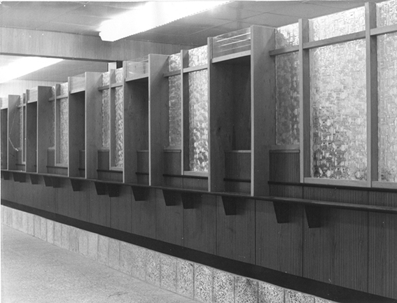 • In den 1960er Jahren entstanden in den Sparkassen der DDR helle und kundenfreundliche Filialen. Doch die Freude darüber währte nicht lange. Als Täter bei einem Überfall den Schaltertresen übersprangen, entstanden neue Vorschriften zum Aufbau schützender Fronten. : © Historisches Archiv des OSV