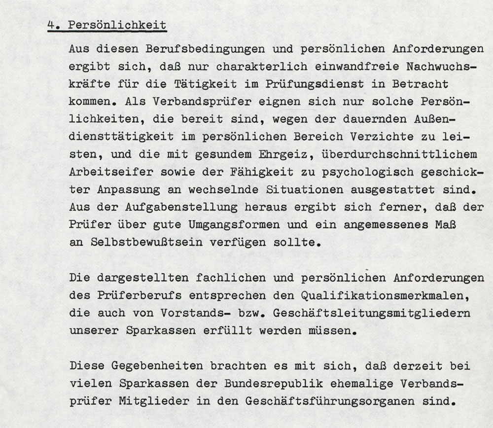 Was das Personal betraf, so sah der Stellenplan vor 30 Jahren 68 Stellen vor. Für die damals 196 Mitgliedssparkassen waren 52 Prüfer in der Außenorganisation vorgesehen. Der personelle Aufbau der Prüfungsstelle erforderte verschiedene Maßnahmen. So sollten sich zum Beispiel die ehemaligen Sparkassenrevisoren der staatlichen Finanzrevision qualifizieren und die DDR-Sparkassen zusammen mit Kollegen aus westdeutschen Prüfungsstellen, die zur Unterstützung abgeordnet wurden, prüfen. Bereits Ende Mai hatten sich die Prüfungsstellenleiter dafür ausgesprochen, den Ostverband mit seinen damals nur 15 Prüfern personell zu unterstützen.****** So sollten der Einsatz fremder Wirtschaftsprüfer und Auswirkungen auf die Prüfungshoheit verhindert werden. Was den Aufbau eines eigenen Personalbestands betraf, so dachte der Sparkassenverband der DDR unter anderem daran, geeignete Akademiker ohne sparkassenspezifische Kenntnisse an Universitäten und Hochschulen zu werben und mit Unterstützung der westdeutschen Sparkassenorganisation auszubilden. An der Deutschen Sparkassenakademie in Bonn hatten sie das Verbandsprüferexamen abzulegen.******* Zur langfristigen Gewinnung von Nachwuchs galt es 1990, die Prüfertätigkeit populärer zu machen, durch die Verbreitung eines entsprechende Berufs- und Leistungsbildes. Dieses ging sogar auf die Persönlichkeit der ostdeutschen Verbandsprüfer ein.