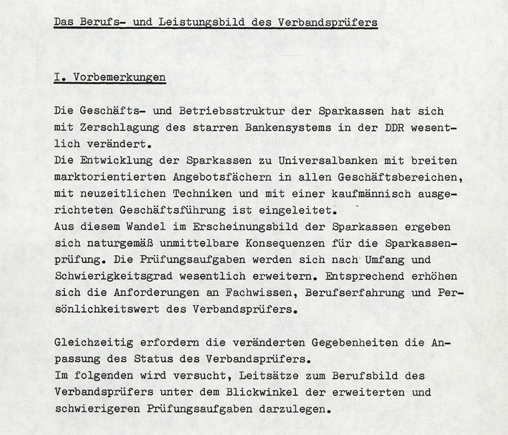 *** Vgl. Sparkassenverband der DDR/ Vorläufiger Verbandsrat: Beschluß Nr. 20/1990 – Prüfungsordnung für die Prüfungsstelle des Sparkassenverbandes der DDR, in: Historisches Archiv des OSV, HA 2/2017 Bd. 1
