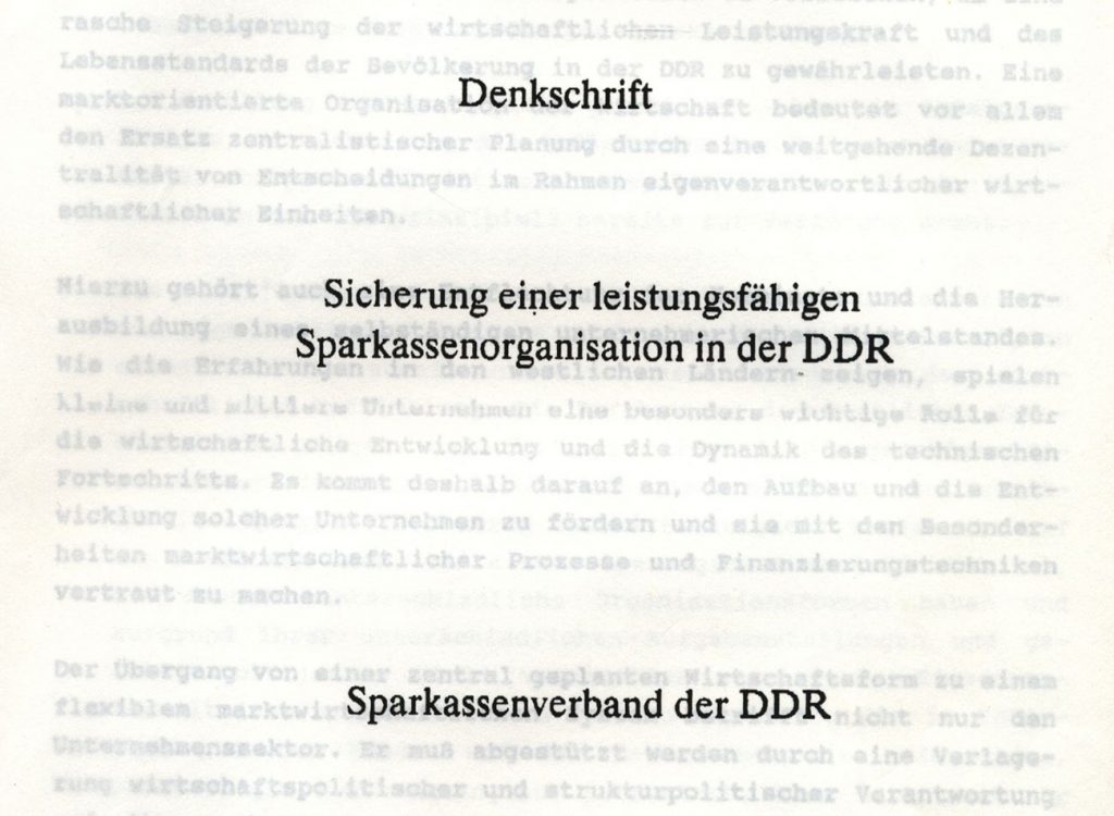 In diesen Zusammenhang ist eine Denkschrift des DSGV einzuordnen, die den zuständigen DDR-Ministerien überreicht wurde.*** Das Werk thematisierte die Bedeutung einer starken kommunalen Selbstverwaltung und eines leistungsfähigen Sparkassenwesens in Ostdeutschland. Es begründete die Notwendigkeit öffentlich-rechtlicher Sparkassen, die im Rahmen der wirtschaftlichen Eigenverantwortung der Städte und Gemeinden für ihr Gebiet eine umfassende Versorgung der Bevölkerung mit Finanzdienstleistungen gewährleisten sollten. Gerade sie stellten sicher, dass nicht nur die Bevölkerung in Wirtschaftszentren, sondern auch in ländlichen Regionen und strukturschwachen Gebieten ein Geldinstitut hatte. Für eine ausgewogene Wettbewerbsstruktur und zur Verhinderung einer, für Verbraucher und Wirtschaft nachteiligen, Dominanz von Banken brauchte es überall kommunale Sparkassen, die eben nicht auf absolute Gewinnmaximierung, sondern auch auf Gemeinnutz bedacht seien.