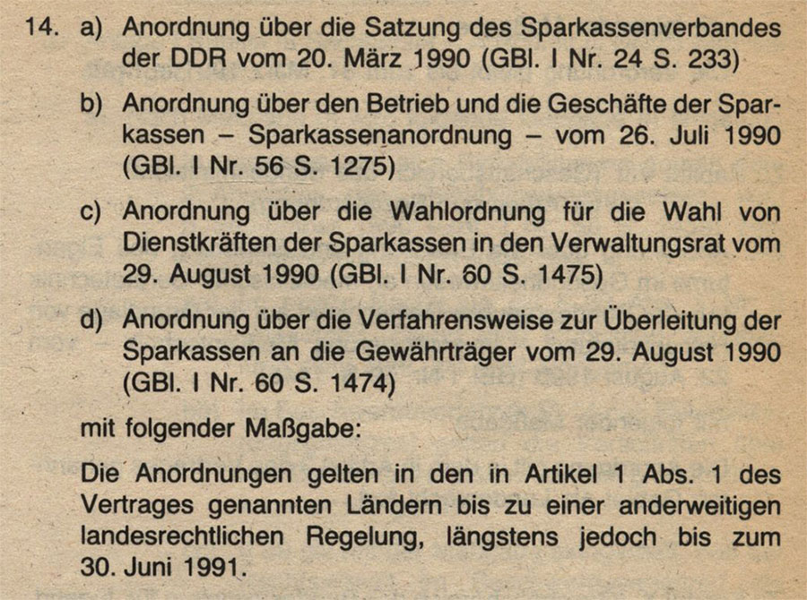 • Auf den letzten Seiten der letzten gedruckten Ausgabe des DDR-Gesetzblatts ist eine Vereinbarung zwischen Bundesrepublik und DDR zum Einigungsvertrag vom 18. September zu finden, die sich auch der Übernahme von Rechtsvorschriften widmete. Das DDR-Sparkassengesetz wurde indes gemäß § 9 Abs. 1 des Einigungsvertrags zu Landesrecht. : © Historisches Archiv des OSV