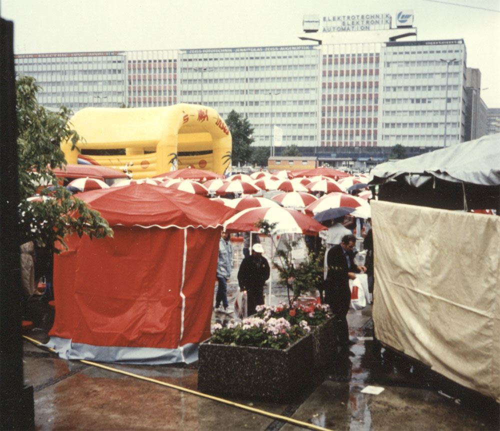 Im Gebäude hatte die Sparkasse einen telefonischen Beratungsdienst für Anfragen zur Währungsunion eingerichtet. Persönlich kamen trotz des Dauerregens immerhin rund 40.000 Menschen zum Alexanderplatz. Sie holten sich Tipps zur Währungsumstellung und ließen sich das neue Angebot der DDR-Sparkassen, das diese auch mit Unterstützung ihrer westdeutschen Partnersparkassen realisieren konnten, vorstellen. Auch direkt vor Ort gab es eine Zusammenarbeit zwischen Ost und West. So waren etwa Frank Axel, damals Verbandsdirektor der Abteilung Passivgeschäft, Zahlungsverkehr, Wertpapiere beim Sparkassenverband der DDR, und Hans E. Giese, Referatsleiter in der Abteilung Grundsatzfragen beim Deutschen Sparkassen- und Giroverband, für den Infostand zum Thema Sparkassenbuch und Girokonto zuständig.***